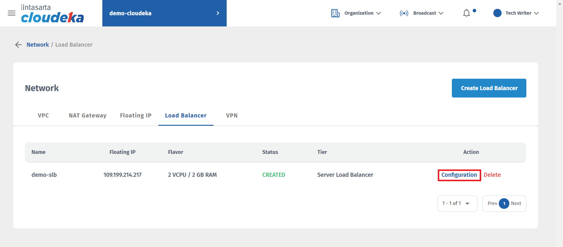 After creating Deka SLB, for the next steps, add backend configuration and frontend configuration. On the Load Balancer page, press the Configuration button.