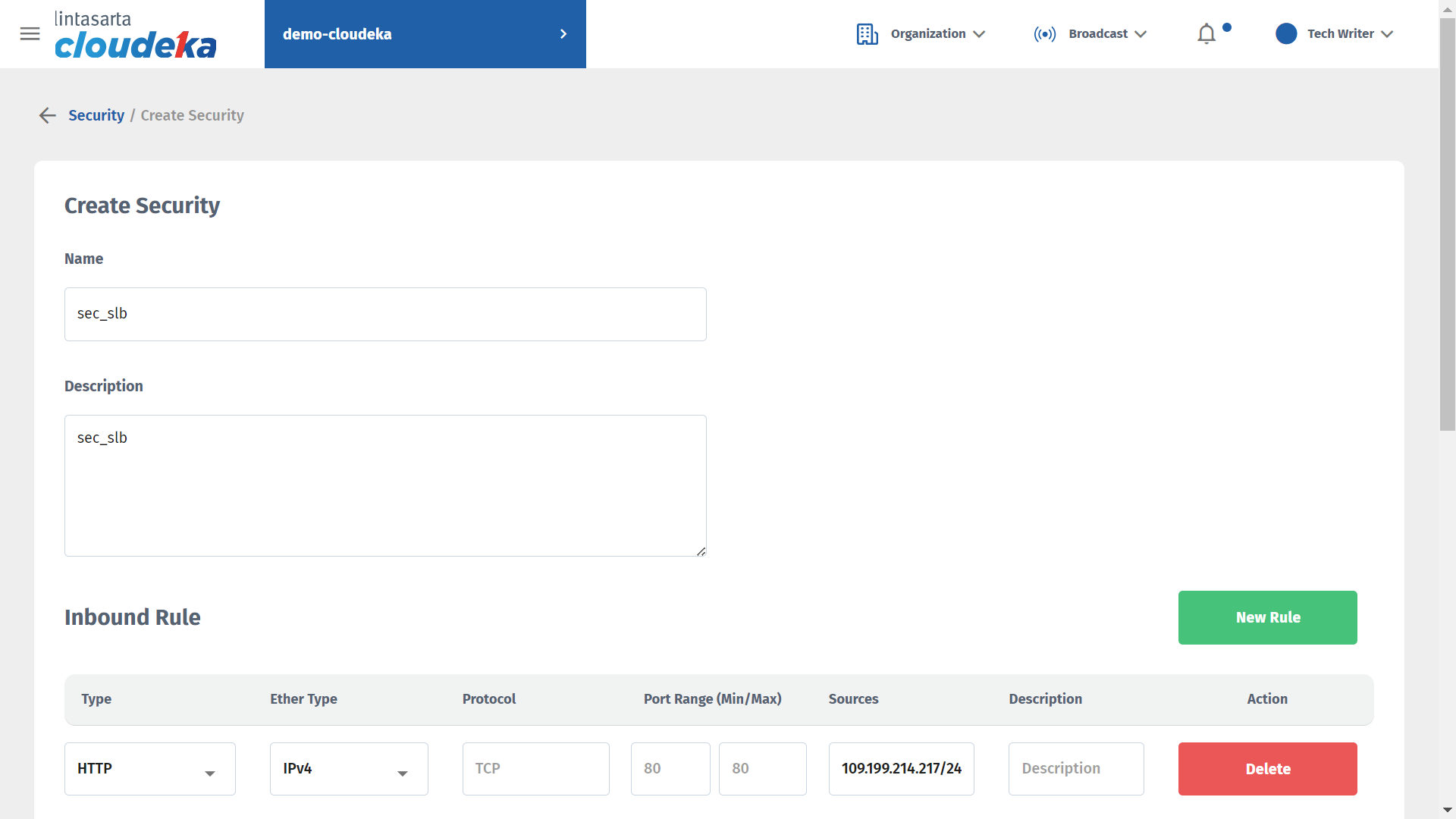 On the Security menu, press the Create Security button, in the Inbound Rule section, press the New Rule button to add the IP address obtained after successfully creating the Deka SLB configuration.