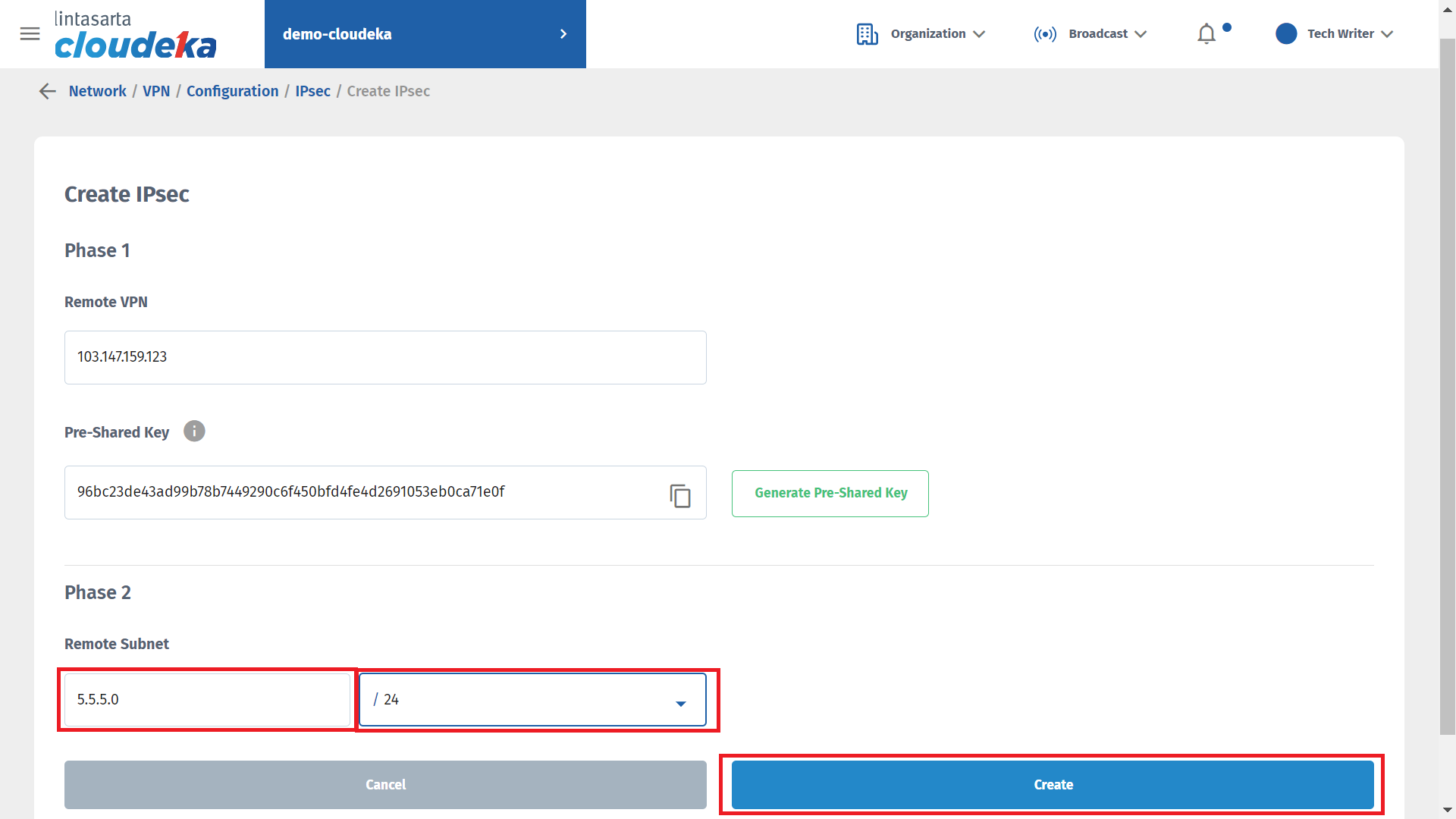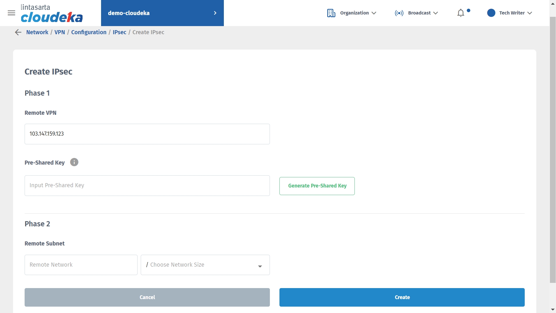 Fill in Remote Subnet with the subnet IP address and prefix used in the destination project.
