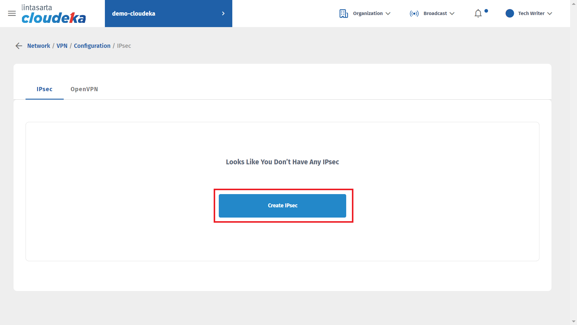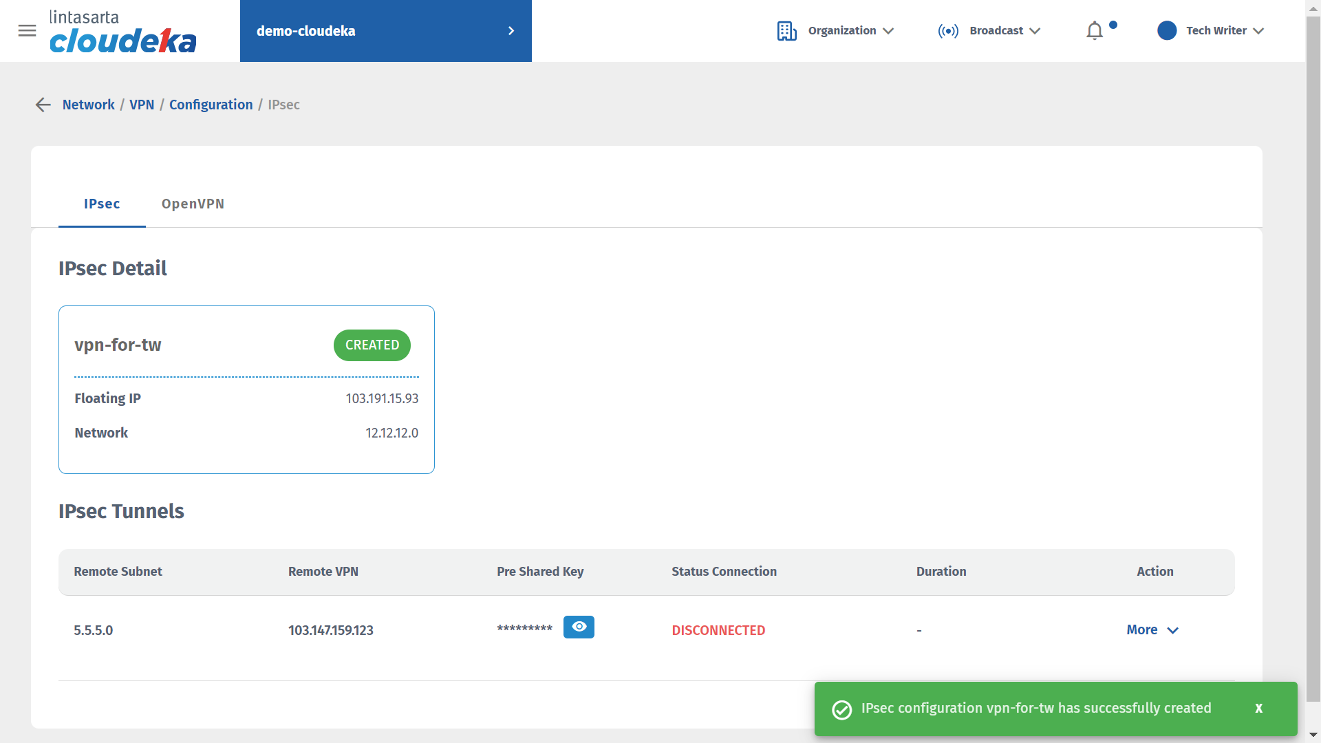 A notification appears "IPsec configuration [vpn-name] has been successfully created".