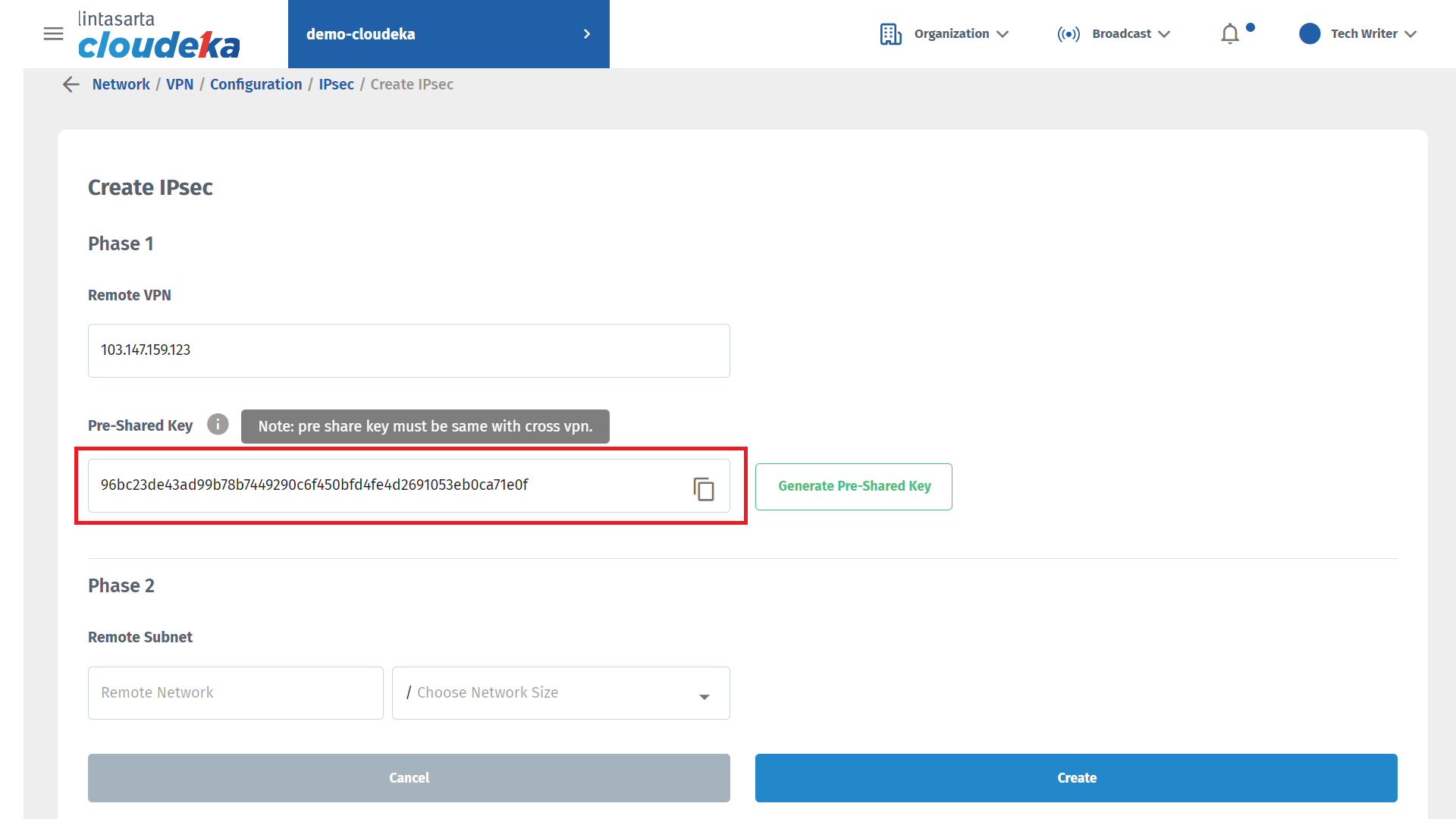 Press the Generate Pre-Shared Key button if you don't have a key yet, whereas if you already have the key from the target project, paste it into the Pre-Shared Key column.