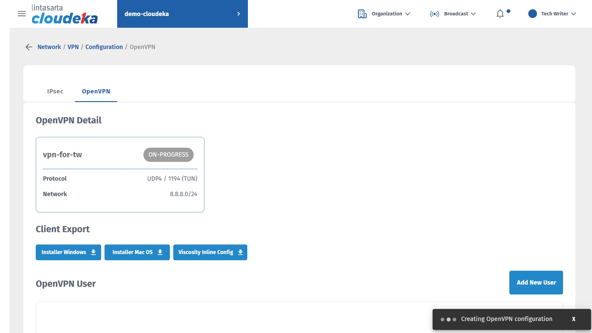 - The notification "OpenVPN configuration vpn-for-tw has been successfully created" appears and the status changes to Created.