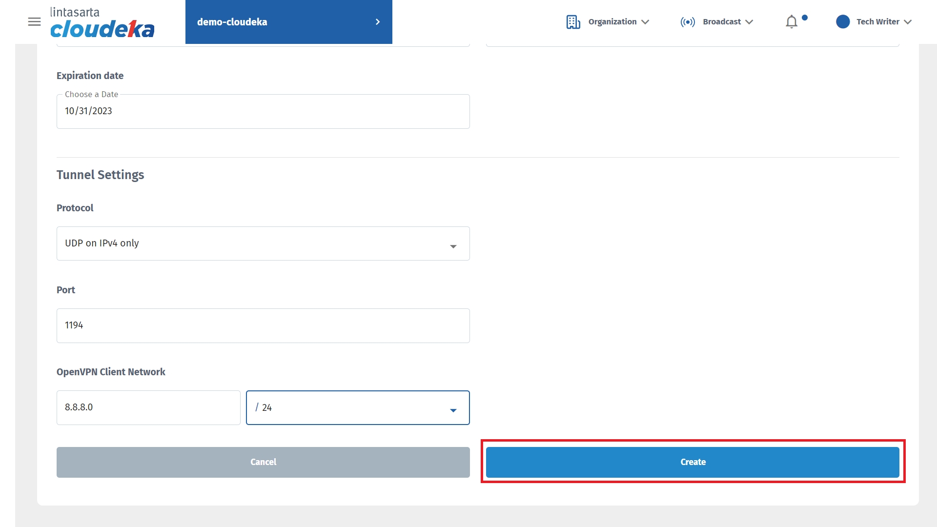 - In the Tunnel Settings section, fill in the Protocol, Port, and OpenVPN Client Network sections.