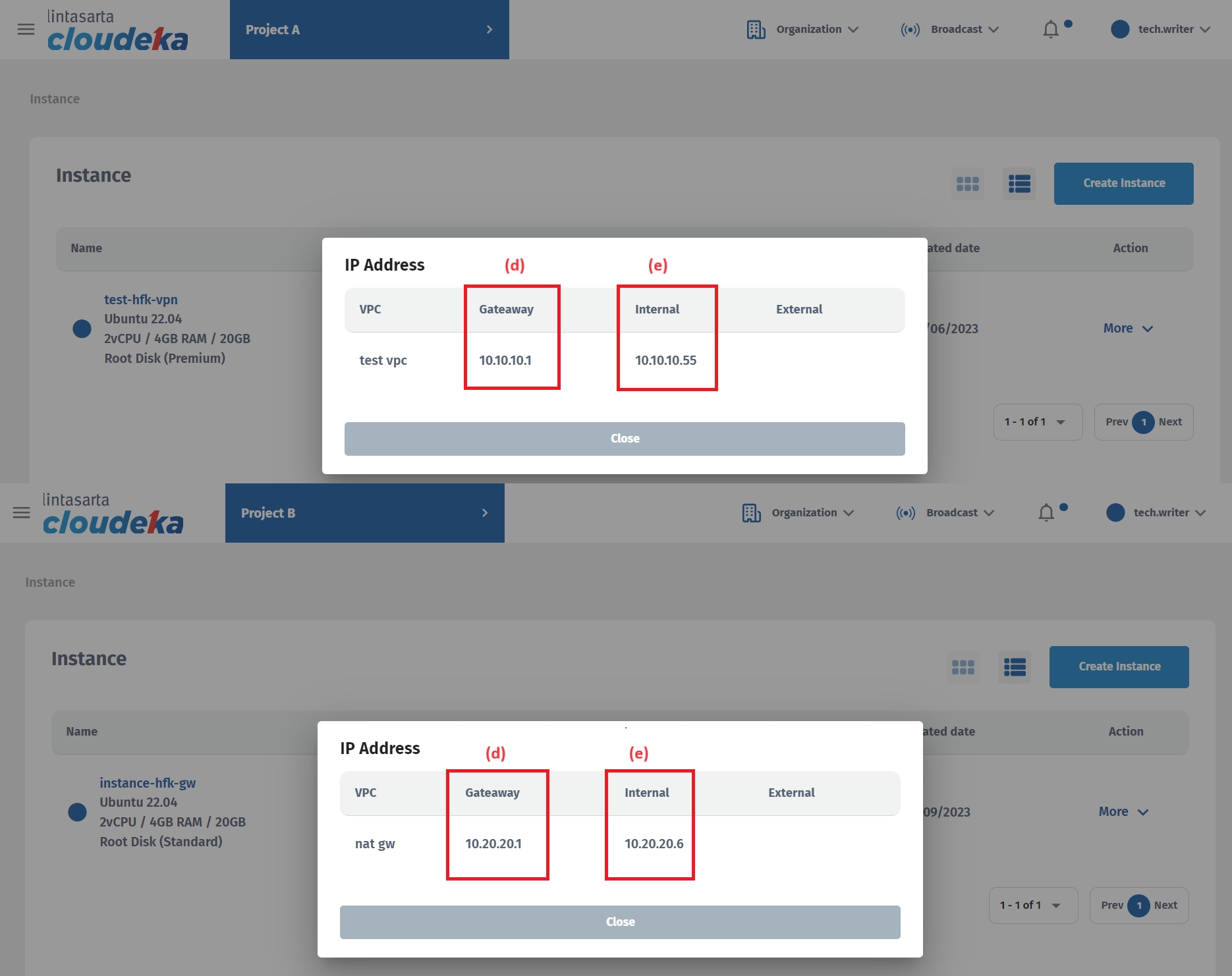 The case examples used in this guide are two projects, each of which has a virtual machine on an Instance in the Cloudeka portal service. The following IP addresses are used in each project.