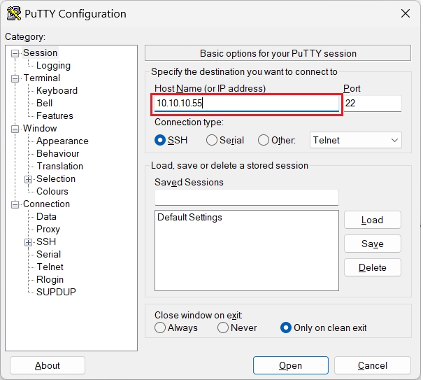 Run putty on your computer. Enter the IP address used by the virtual machine in Project A.