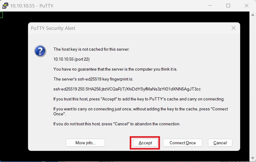 Test the connection via Putty from the Project A virtual machine to the Project B virtual machine by inputting the following syntax: ping 10.20.20.6.