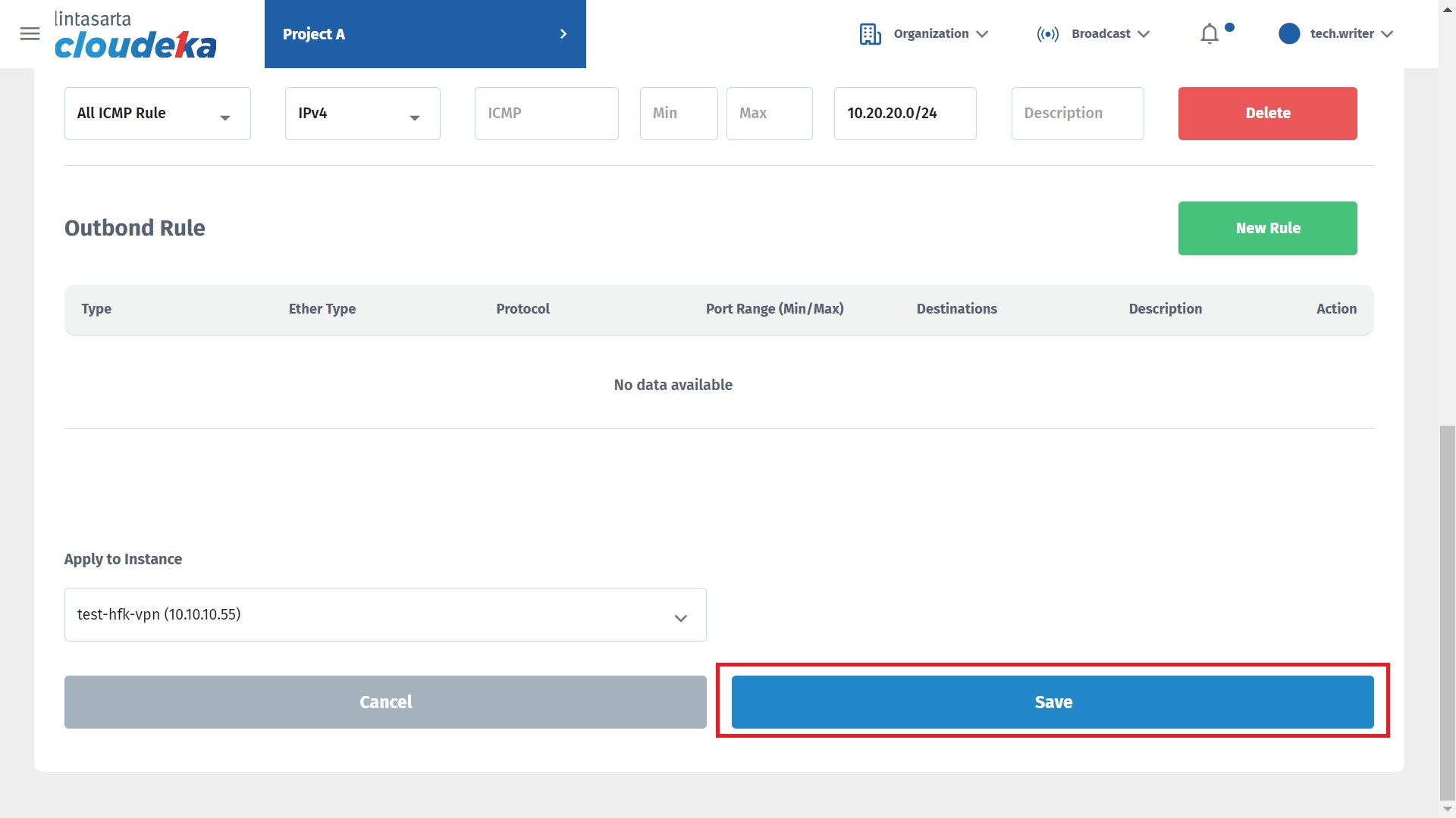 To be able to test the connection to Project B, you must conImage Security on Project A on the Cloudeka portal service, namely adding the IP address of the subnet used by Project B.
