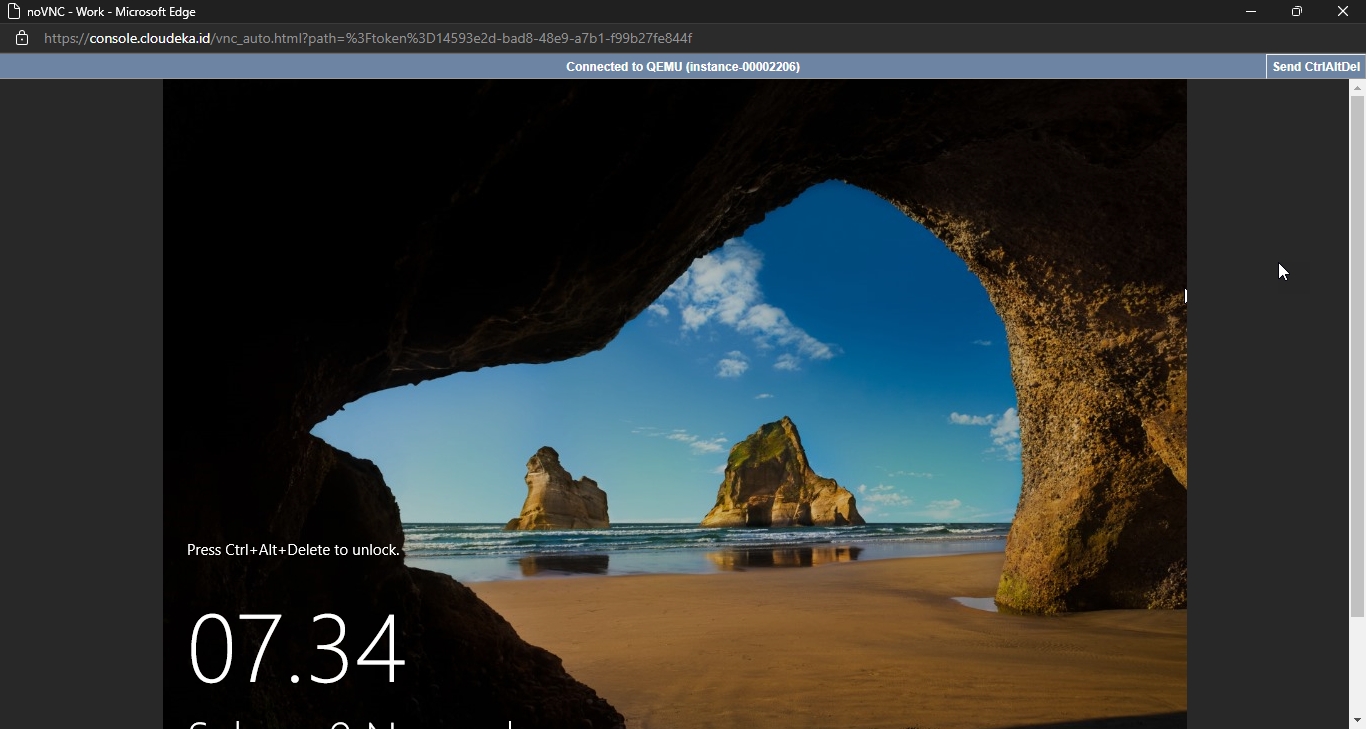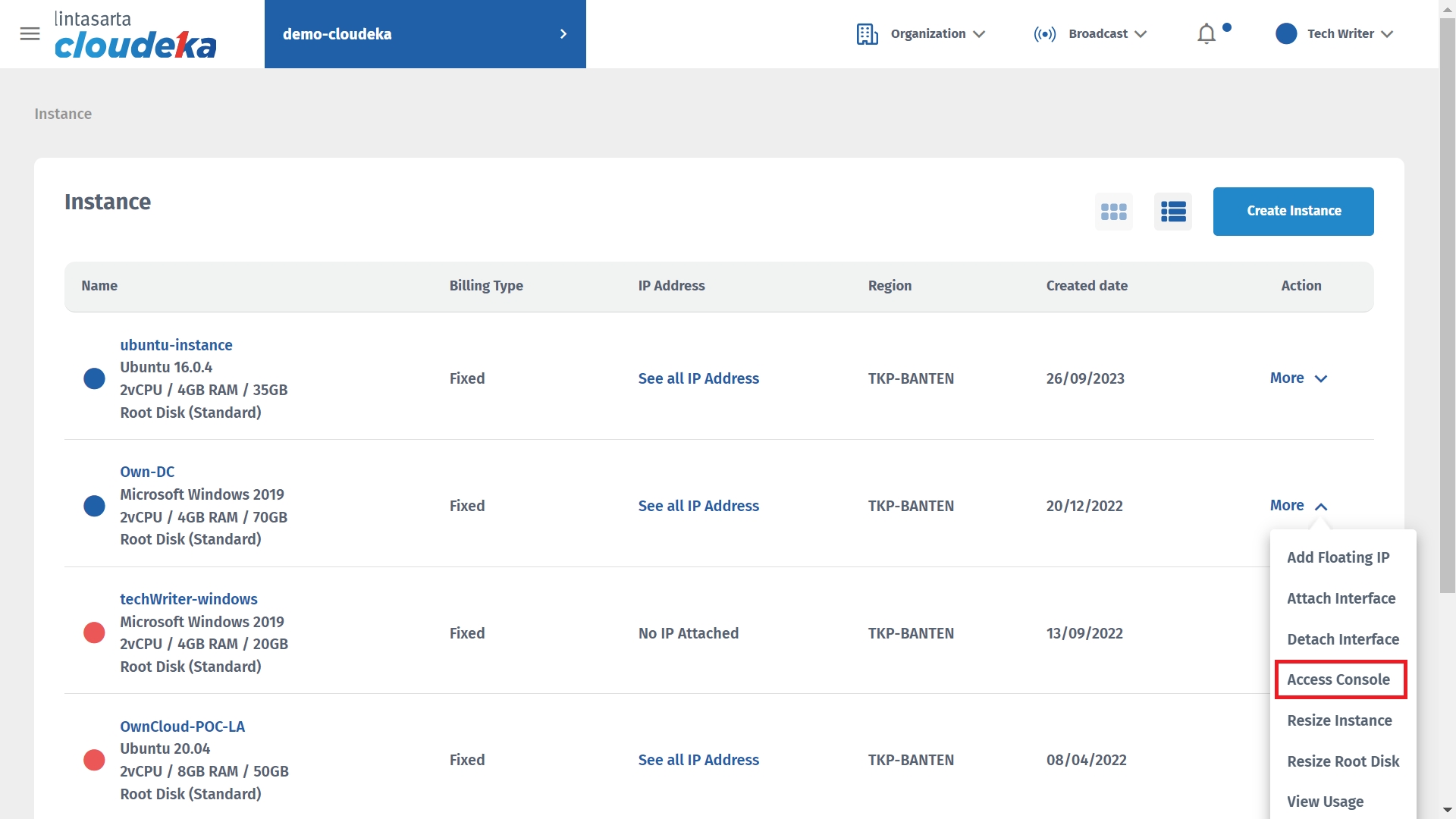 This menu explains how to connect to the virtual machine using Cloudeka Console. Access to the console in the following way, on the Instance page in the Action column, click More then select Access Console.
