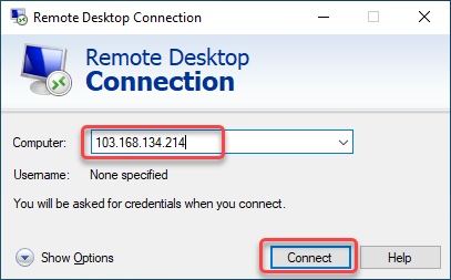 * Type the **Public IP Address** of the VM you want to remote/access, then click **Connect**.