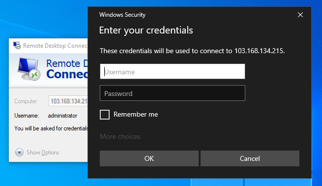 * Fill in your VM credential, then click **ok**.