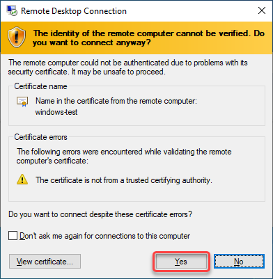 * A certificate will appear for connection verification, click **Yes**.