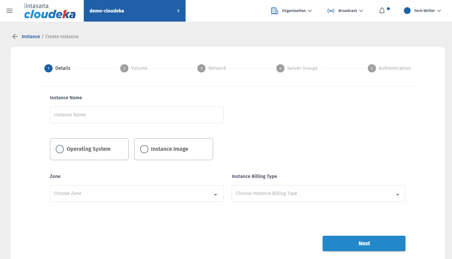On the Create Instance page there are five stages to complete the Instance creation. In the first stage, namely Details, there is Instance Name, Type Operating System or Instance Image, Zone, and Instance Billing Type.