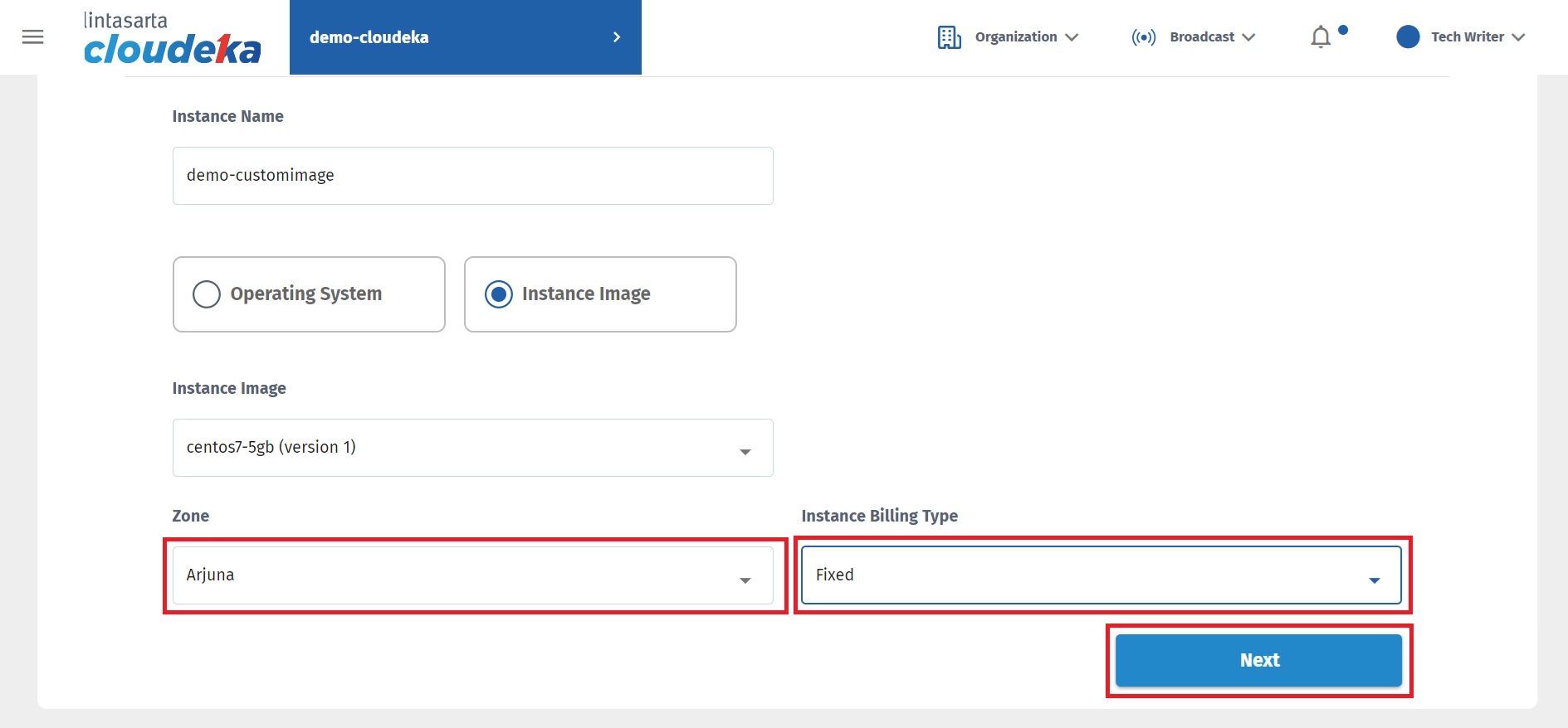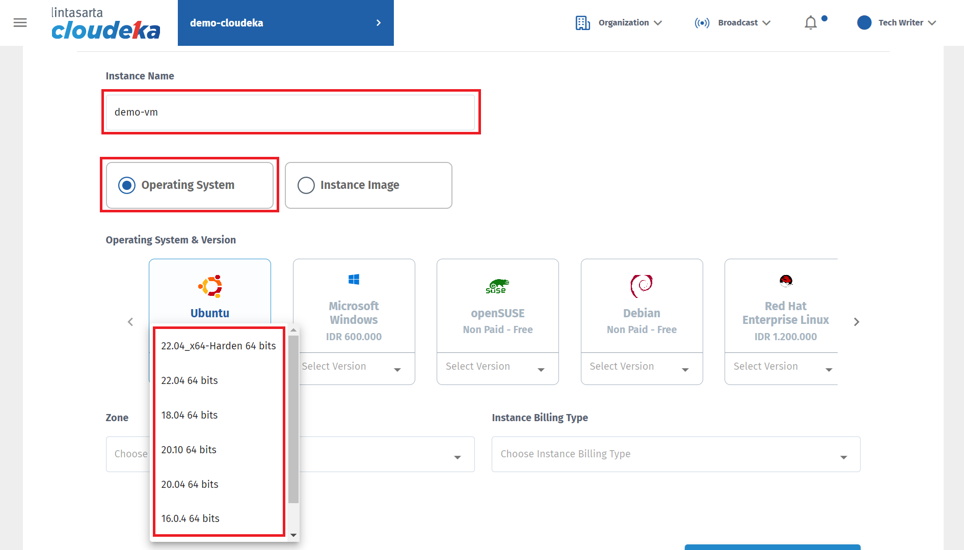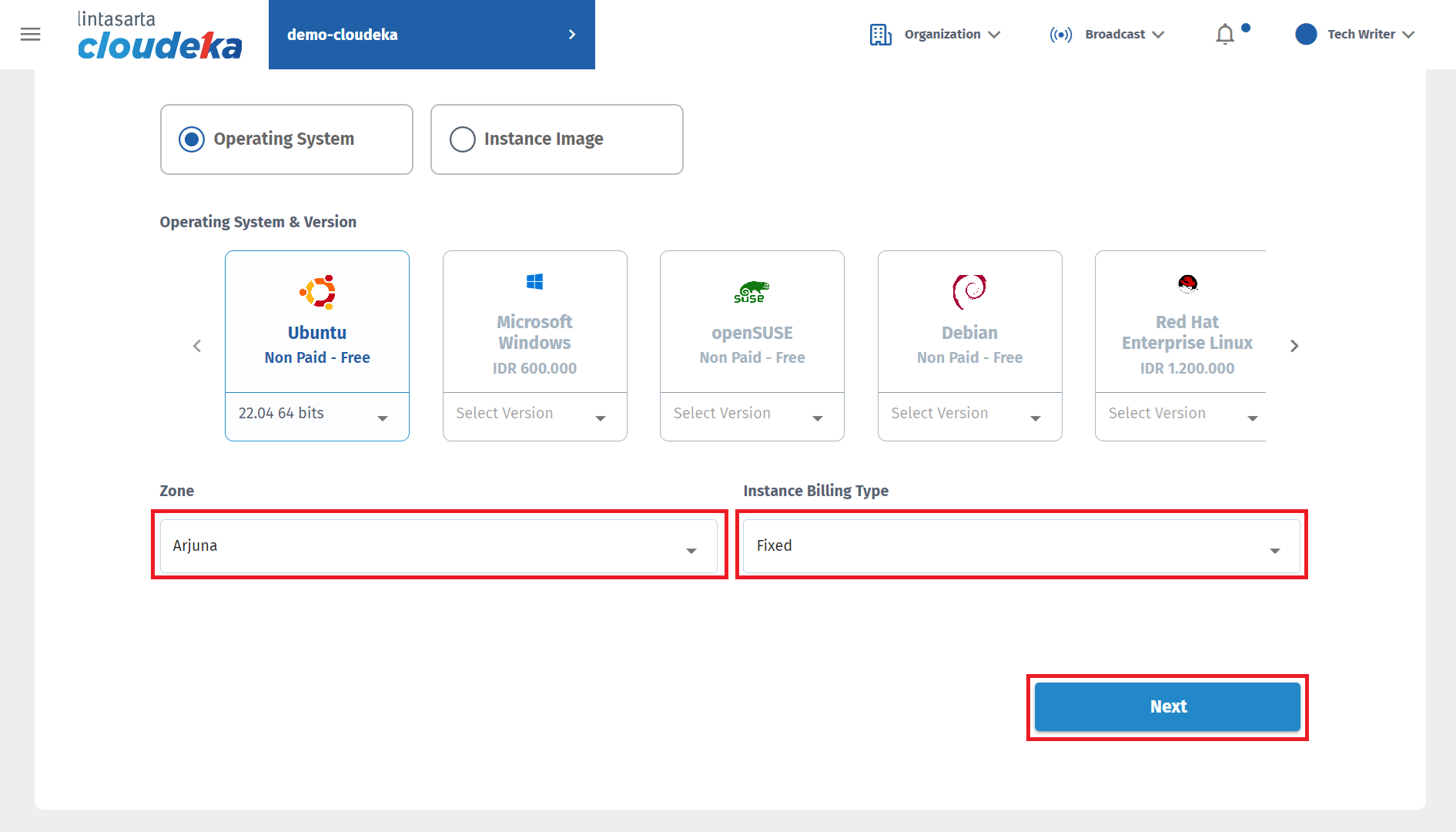 Determine the Zone that will be used to select the data center location used on the VM. Select the Instance Billing Type that will be used. For further explanation regarding billing, you can see the Billing Page. Press the Next button to continue to the next step.