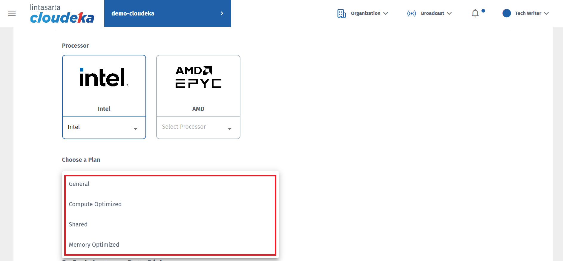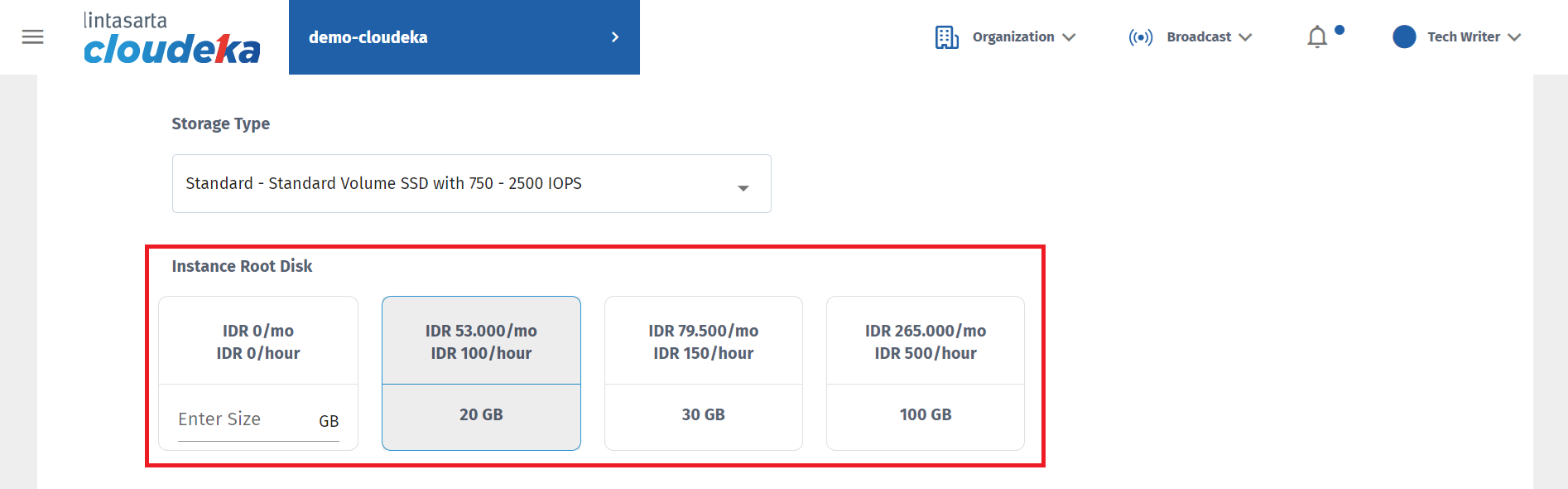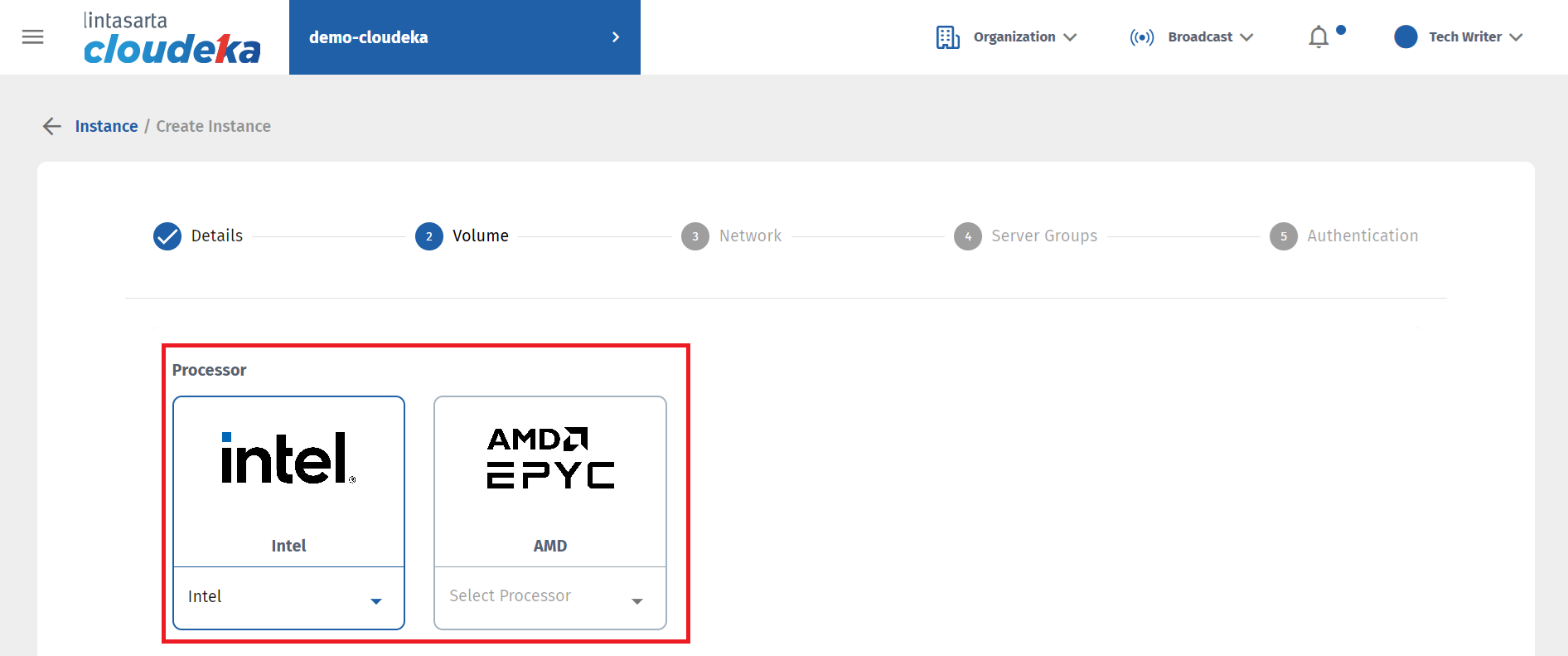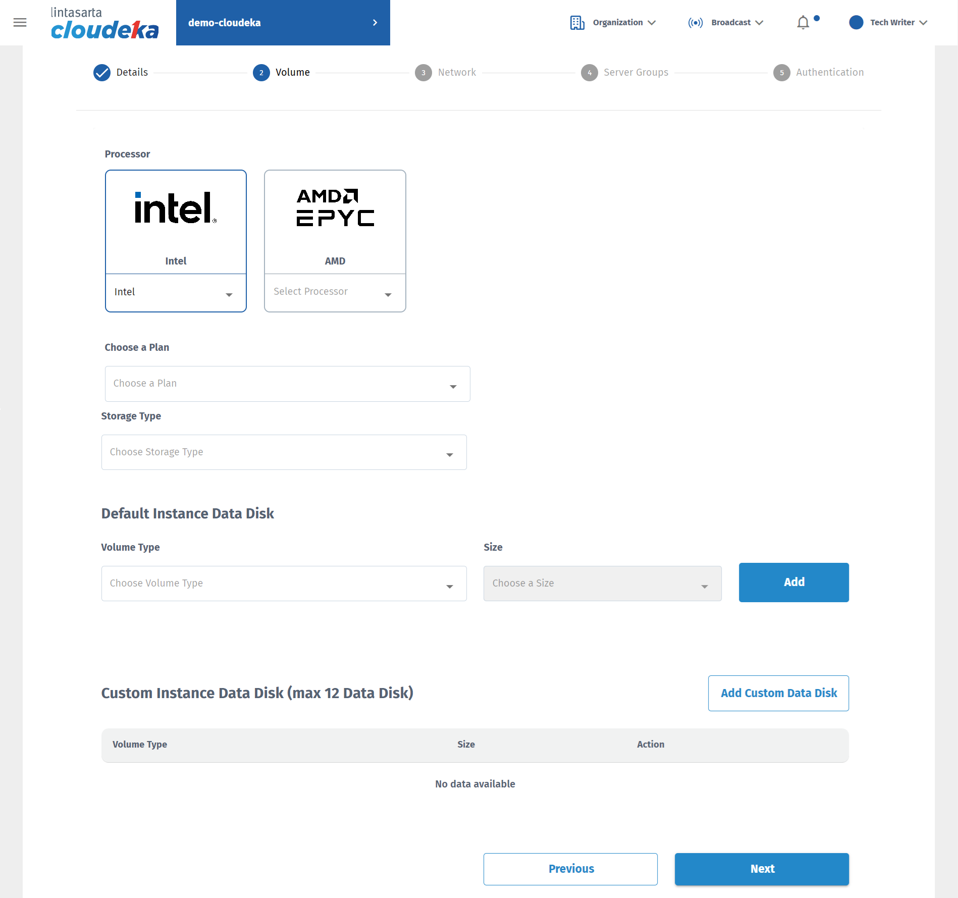 In the second stage, namely Volume, there is the Processor, Storage Type, Default Instance Data Disk, and Custom Instance Data Disk.