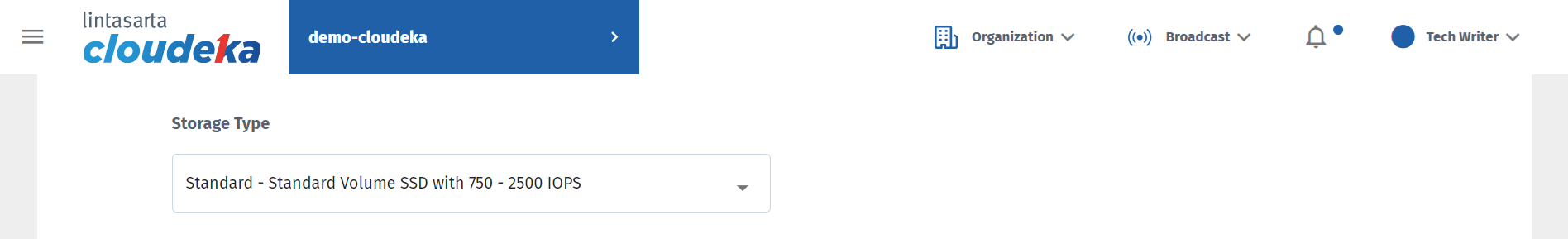 There are two types of storage, Standard Volume SSD with 750 - 2500 IOPS and Premium Volume SSD with 2250 - 4500 IOPS. Select the type of storage used.