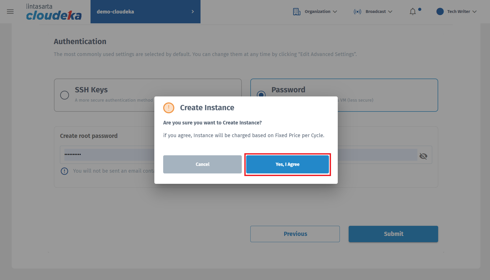 The Create Instance window appears, press the Yes, I Agree button to continue the process.