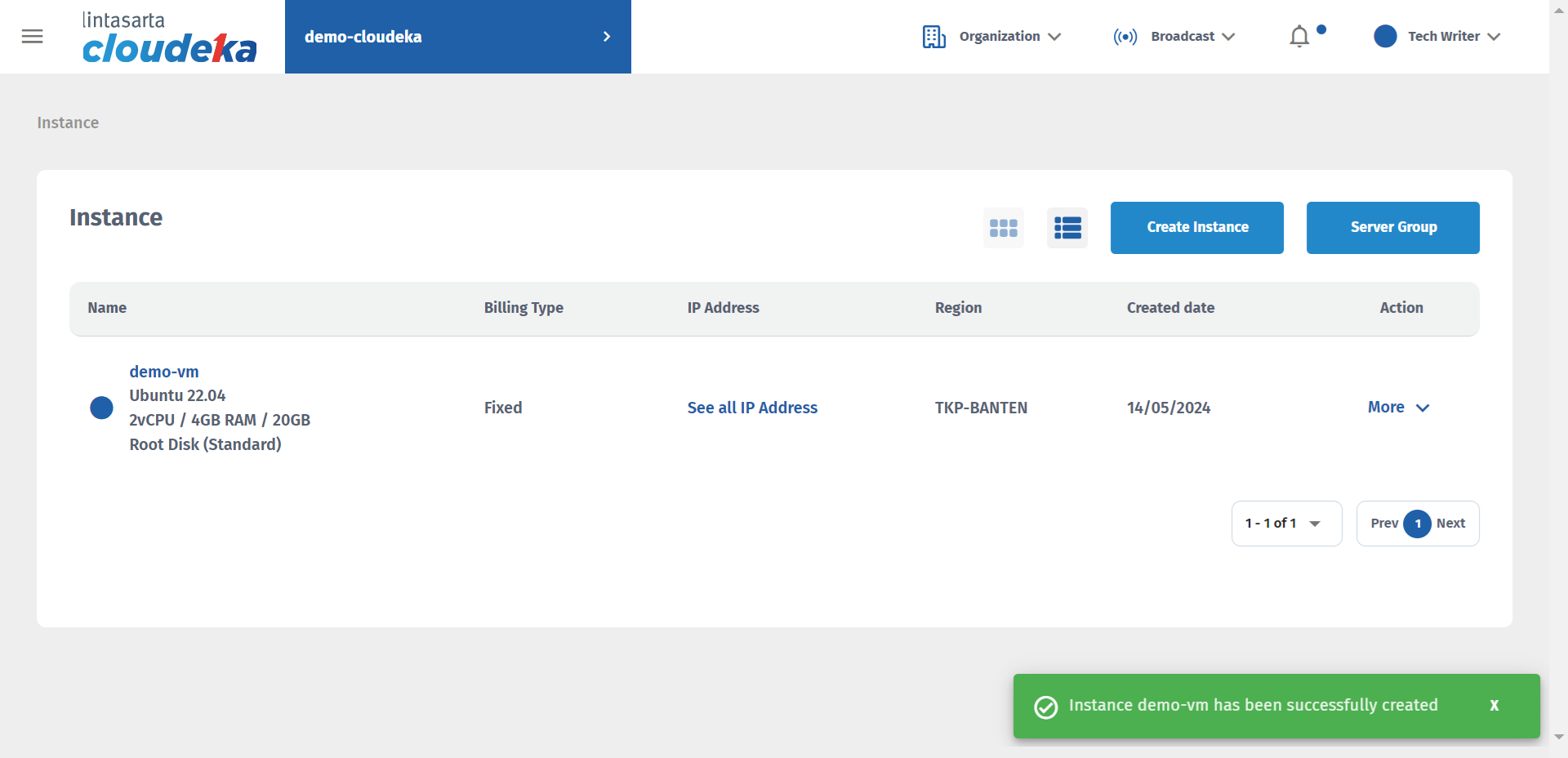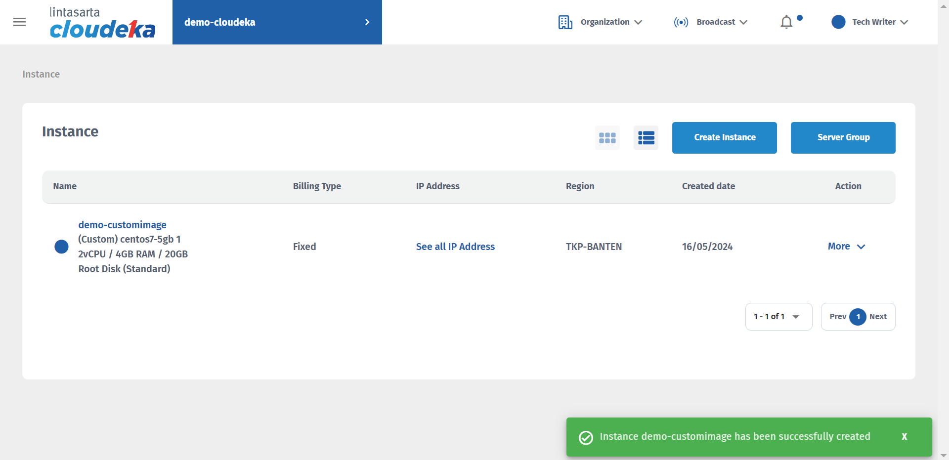 After building the Instance successfully, a success notification appears "Instance (instance name) has been successfully created".