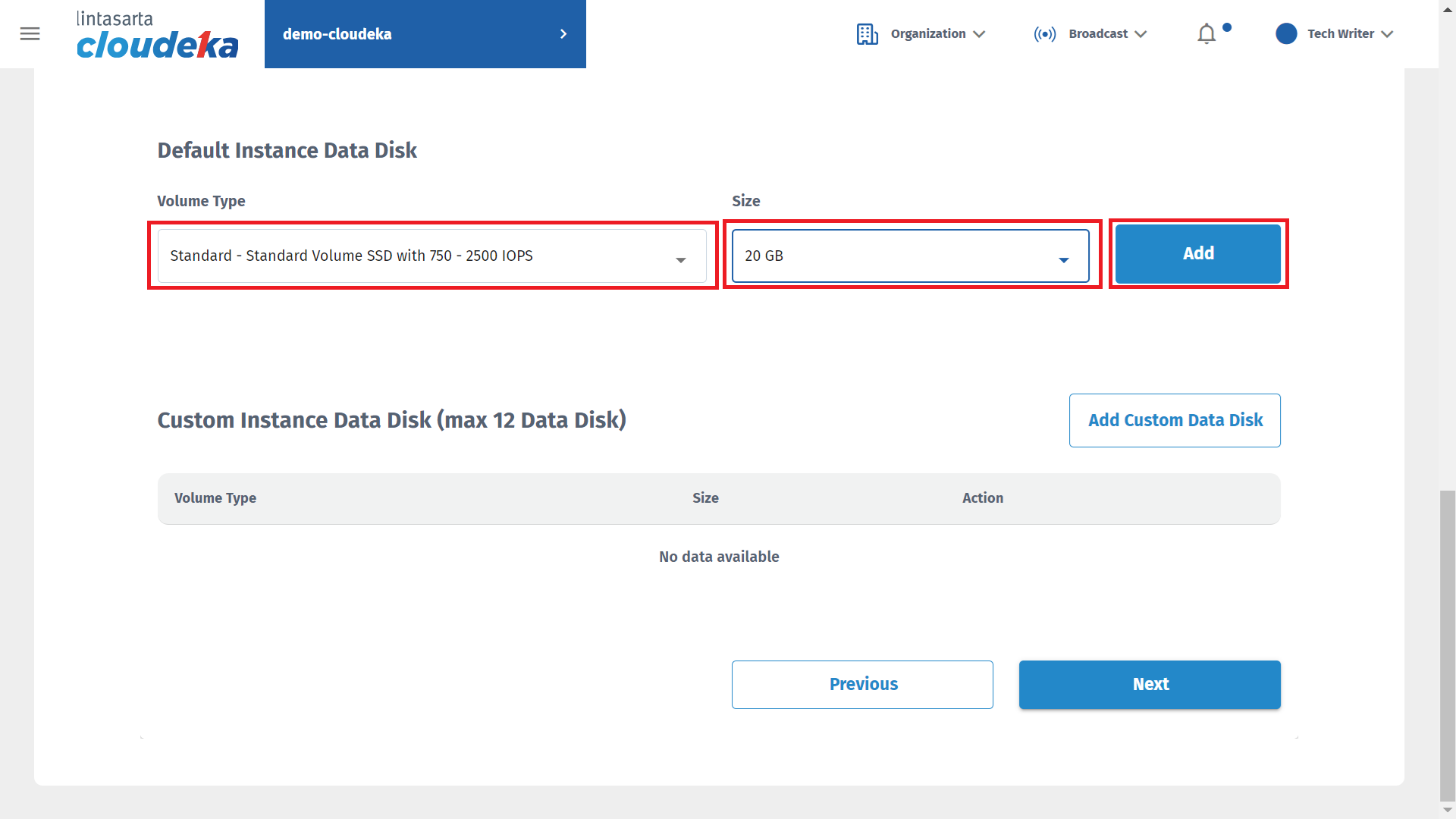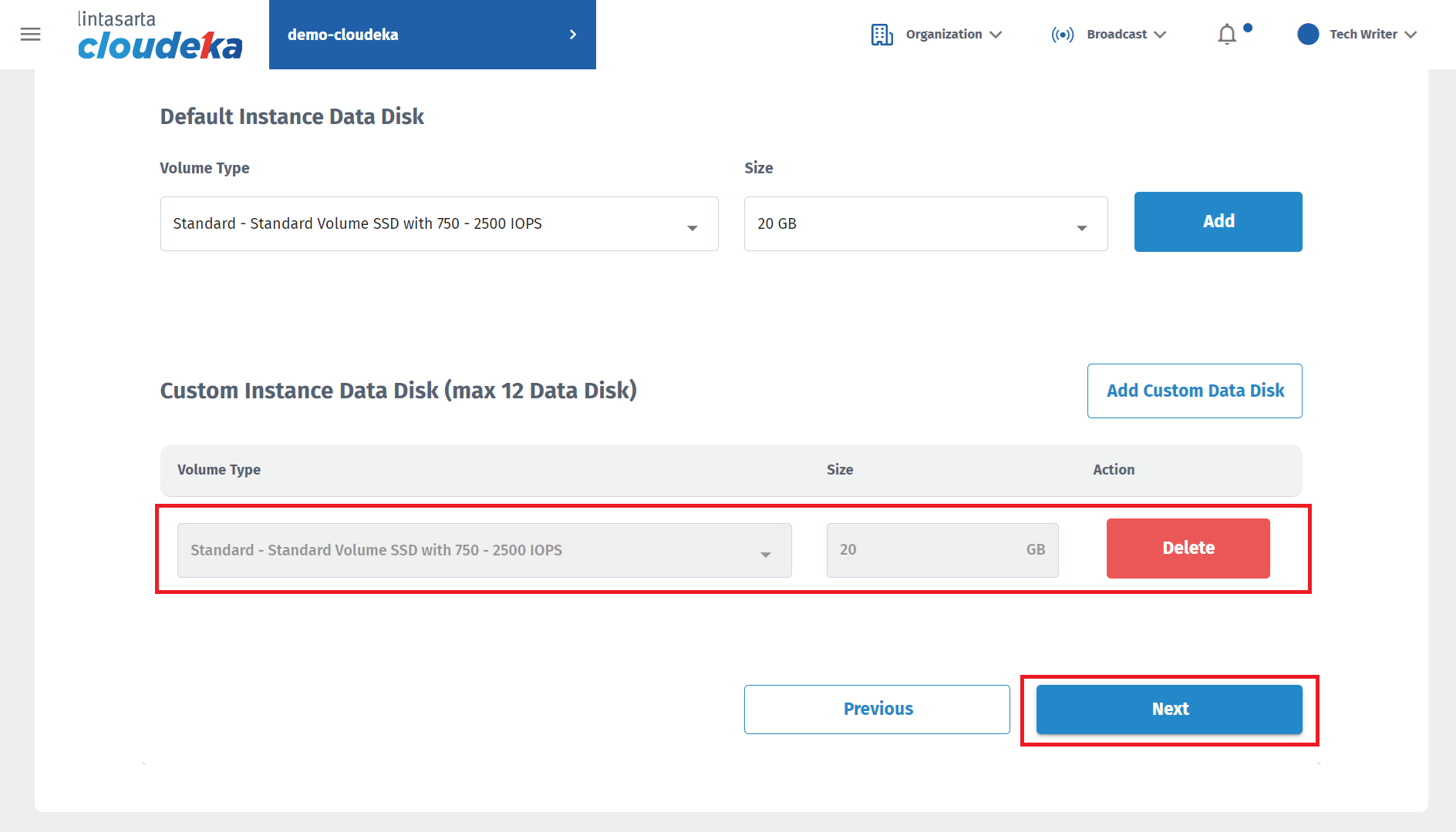 After the Instance Data Disk is added, it will appear in the Custom Instance Data Disk section. You can add a Data Disk by pressing the Add Custom Data Disk button or delete the Data Disk configuration that has been added by pressing the Delete button. If you have configured the Data Disk, press the Next button to go to the next stage.