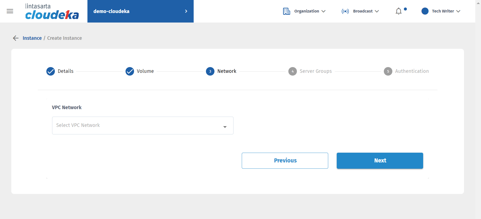 Before creating an instance or VM, you need to create a Virtual Private Cloud (VPC) network in Create VPC Network, and create a Server Group first in Create Server Group.