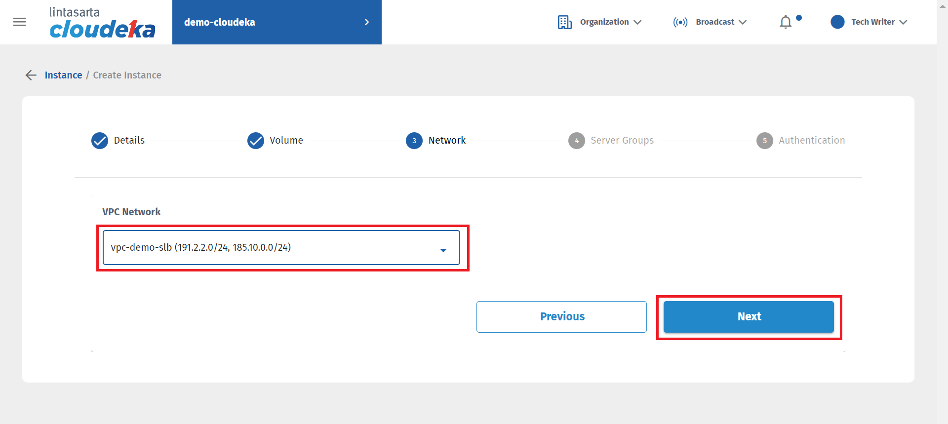 Determine the VPC to use. Press the Next Button to go to the next stage.