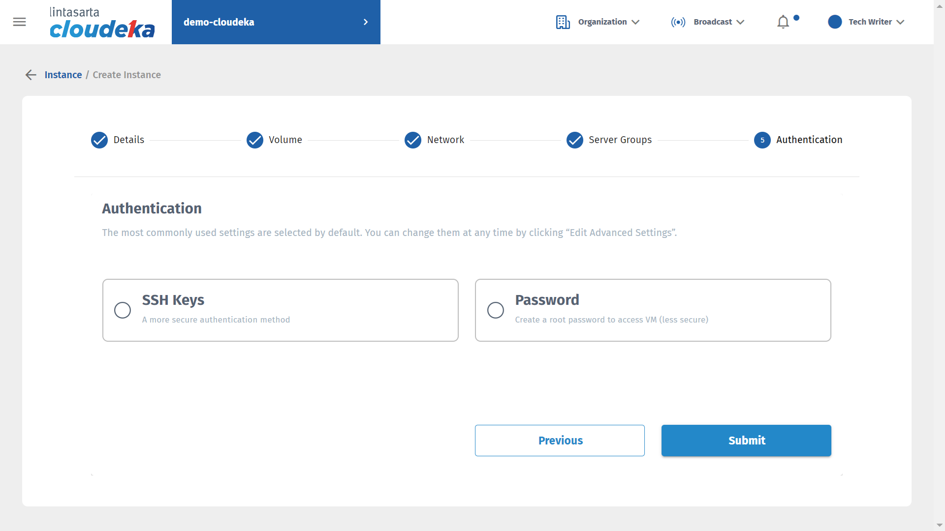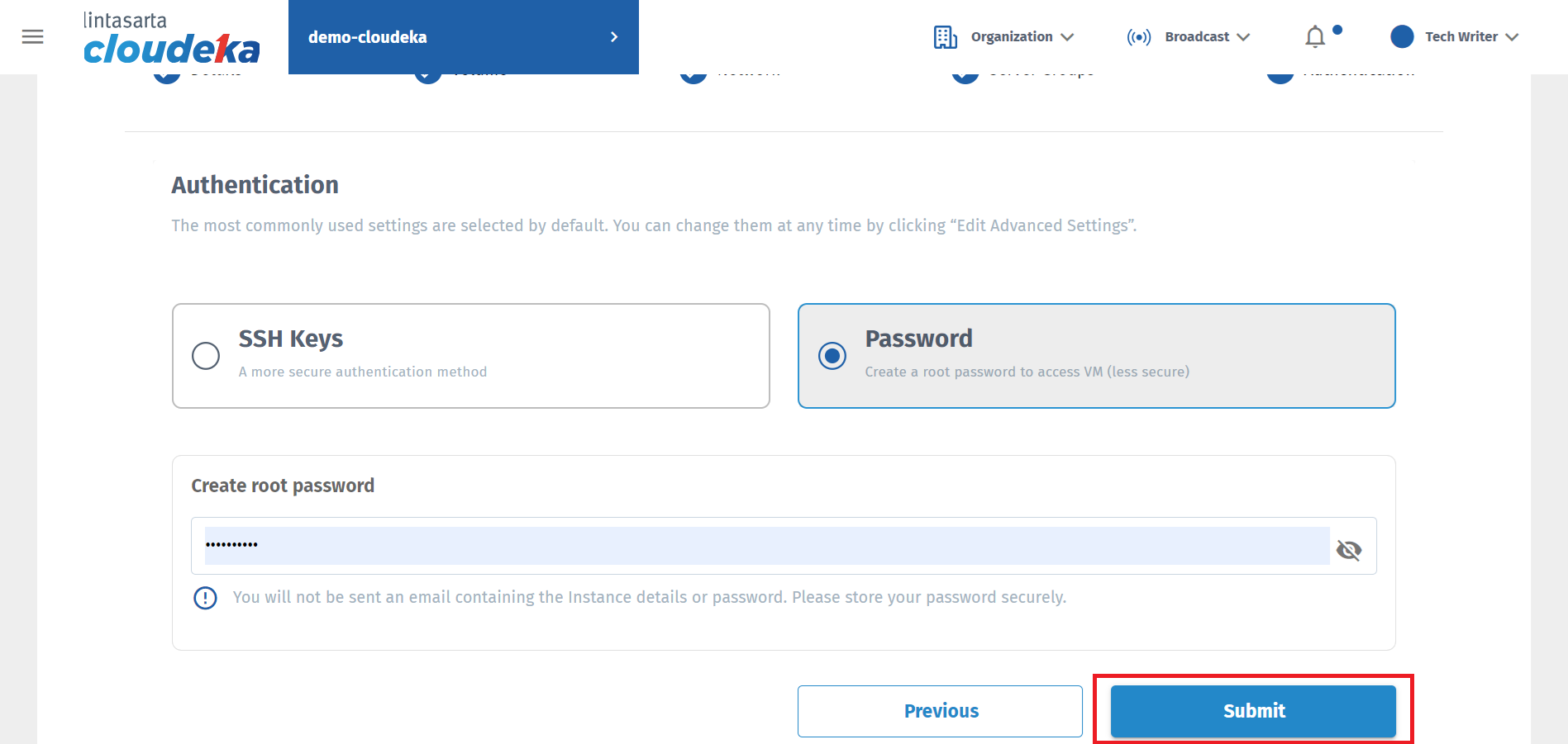 After determining the authentication that will be used, press the Submit button for the VM creation process in the Instance.