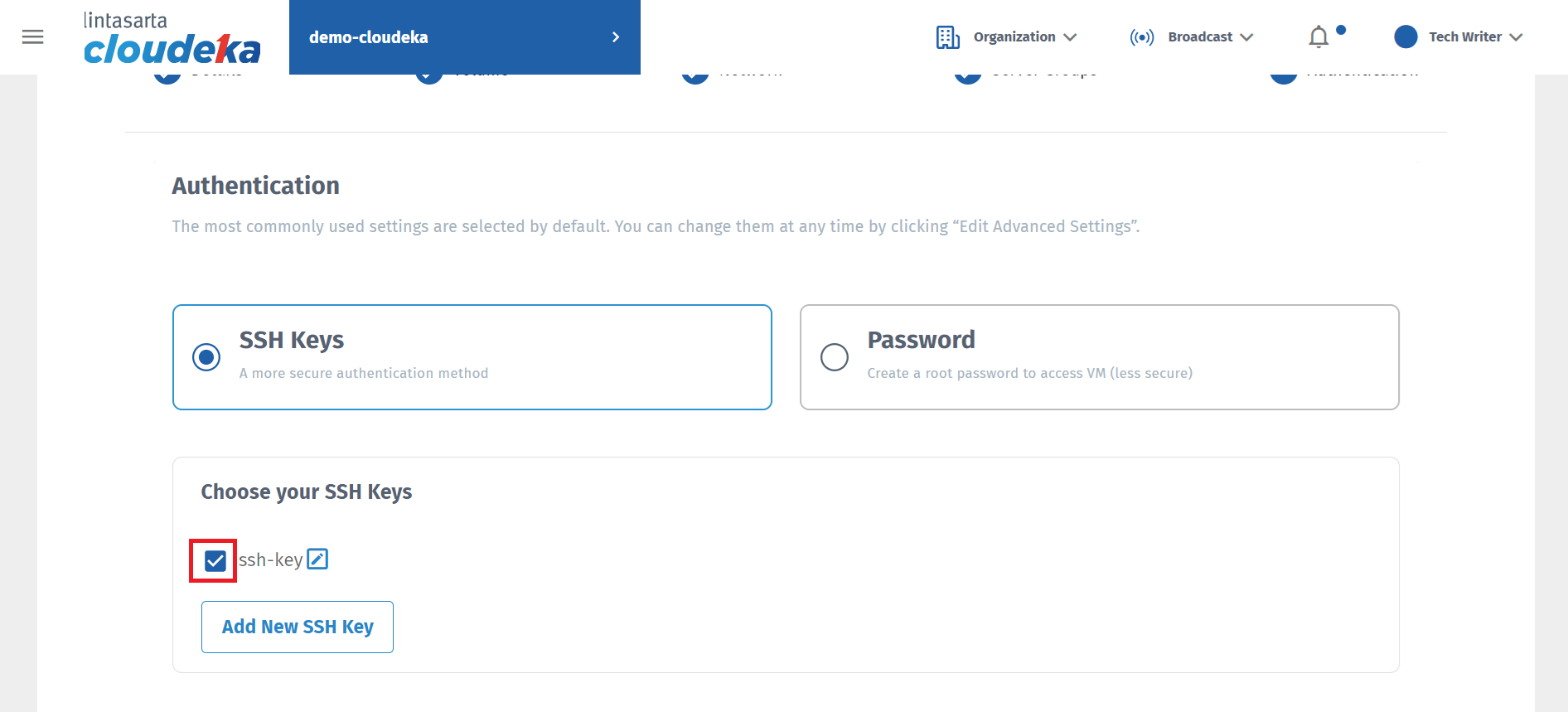 Select SSH Keys for the authentication method, then click New SSH Key.