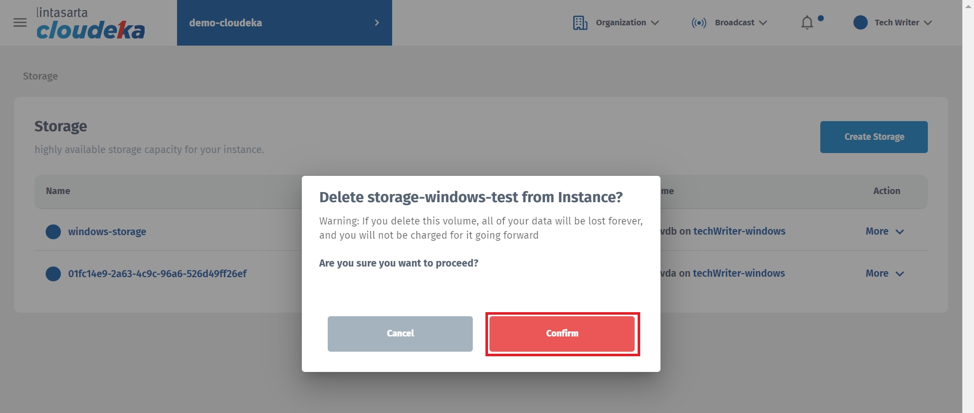 Click the Confirm button to start the process of deleting data storage or cancel if you don't want to continue the process.
