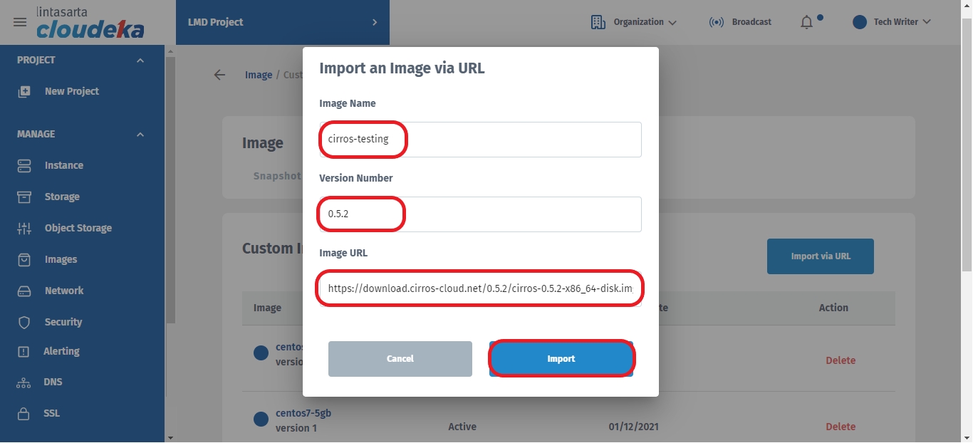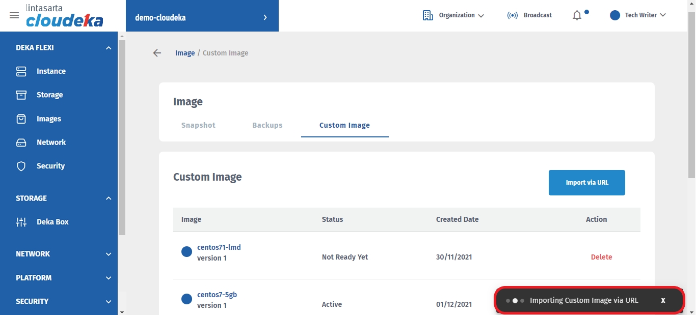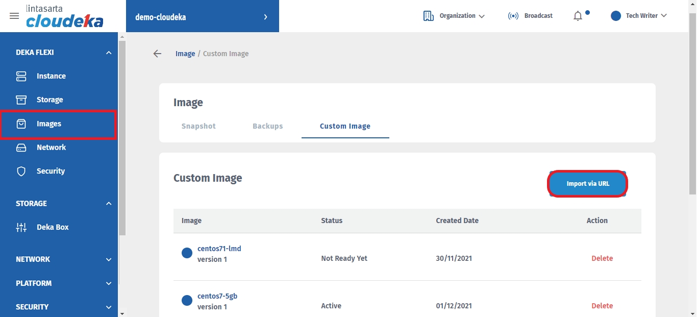 Click Images menu, then go to Custom Image page, On the Custom Images page click Import Via URL button.
