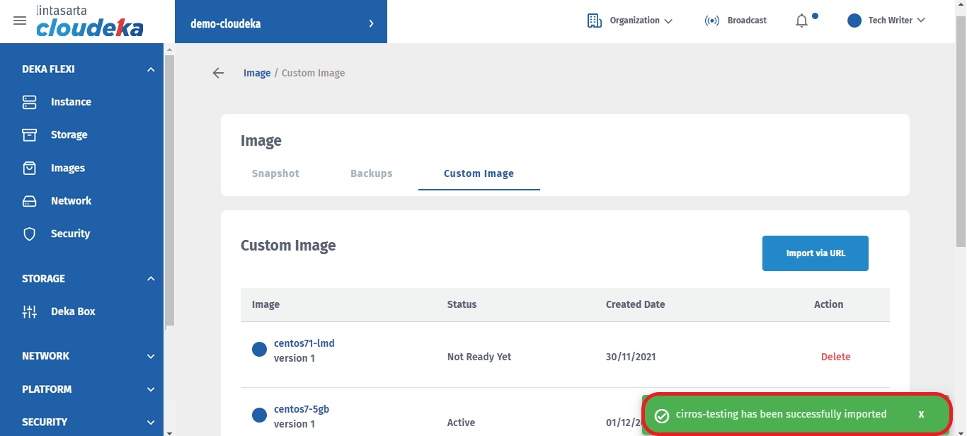 After importing custom image is successful, there will be a success notification "custom-test1 has been successfully imported" and the image status is active.