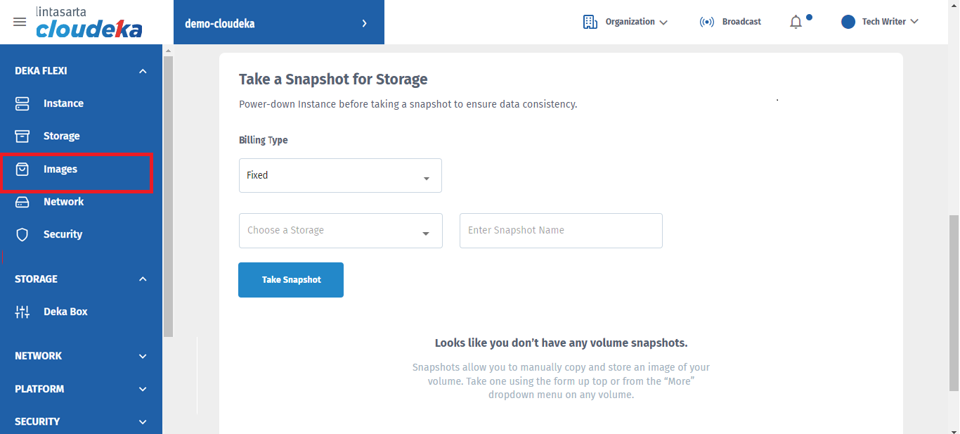 This guide describe how to take a snapshot for a storage. You can create snapshot a storage even while they are attached to running instances.