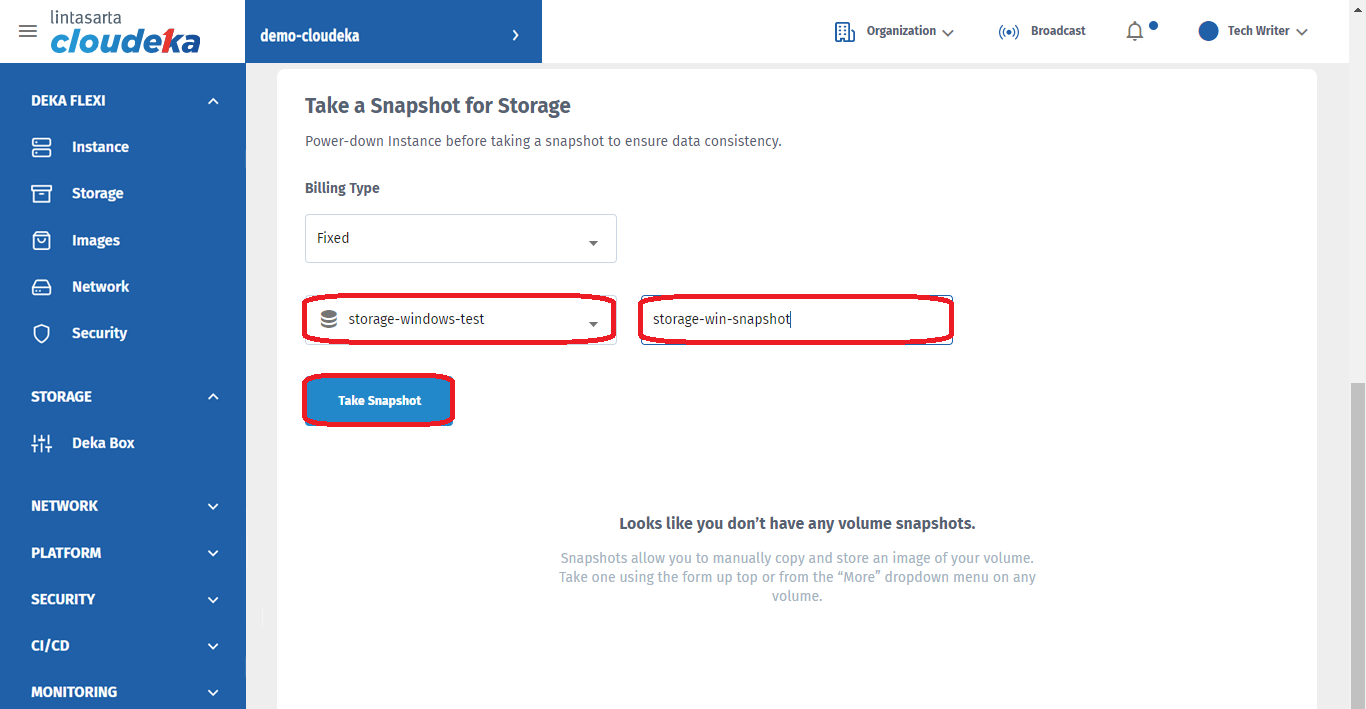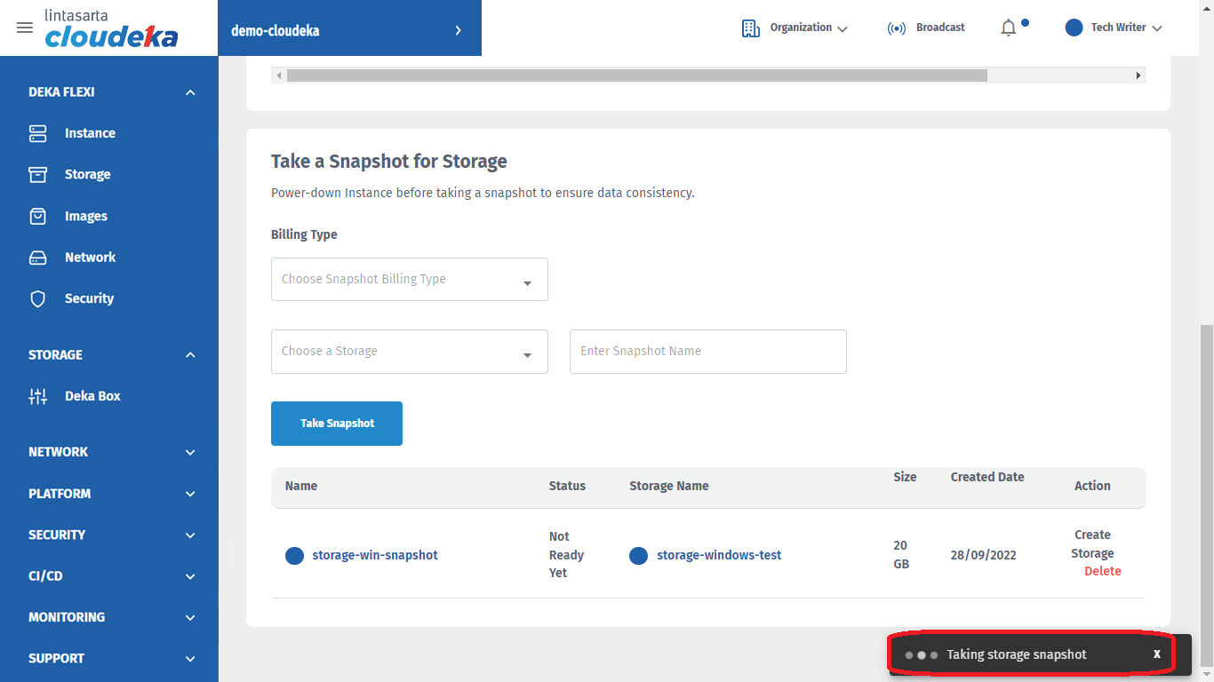 Before doing a snapshot for Storage, you must first have a Storage. If you don't have a Storage yet, you can create a Storage in Create Block Storage