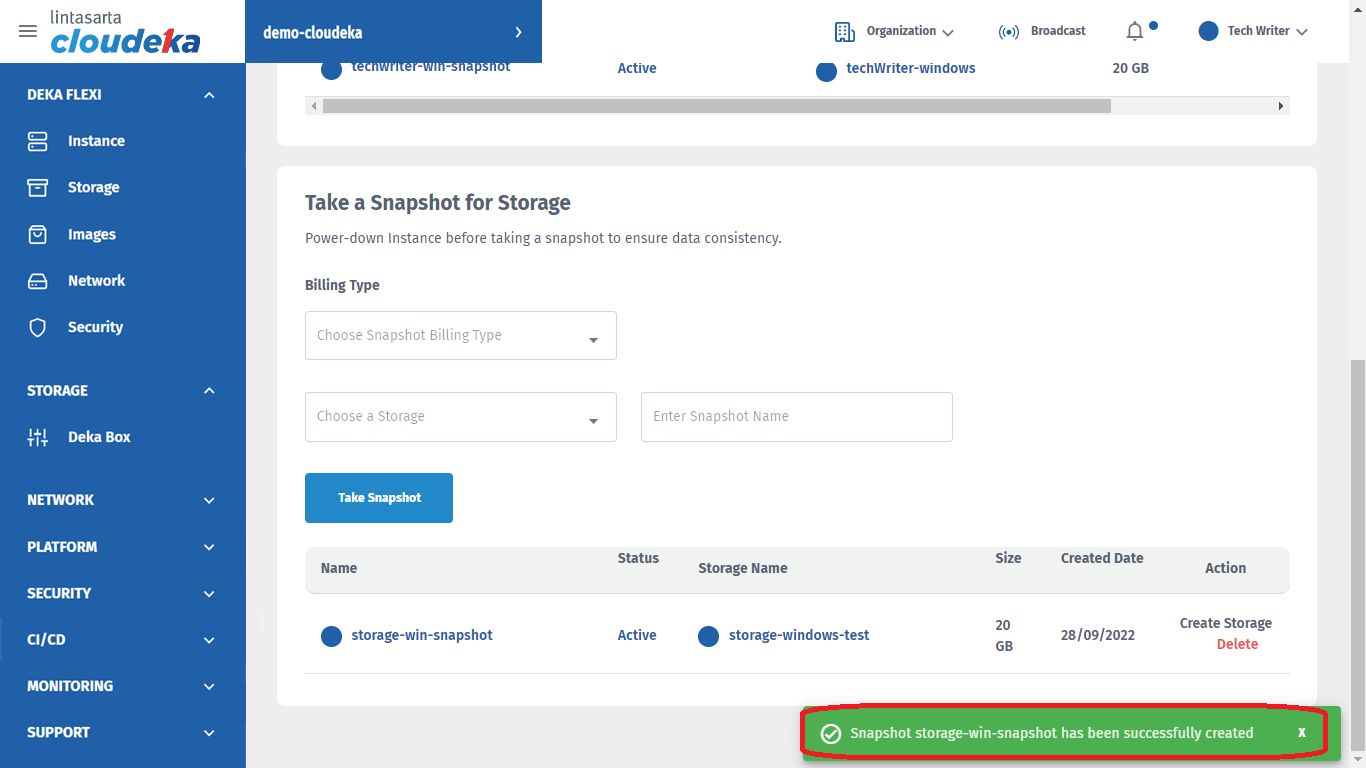If it is successful there will be a notification "Snapshot win_snap_storage has been Successfully Created". A list of snapshots storage will appear, namely: