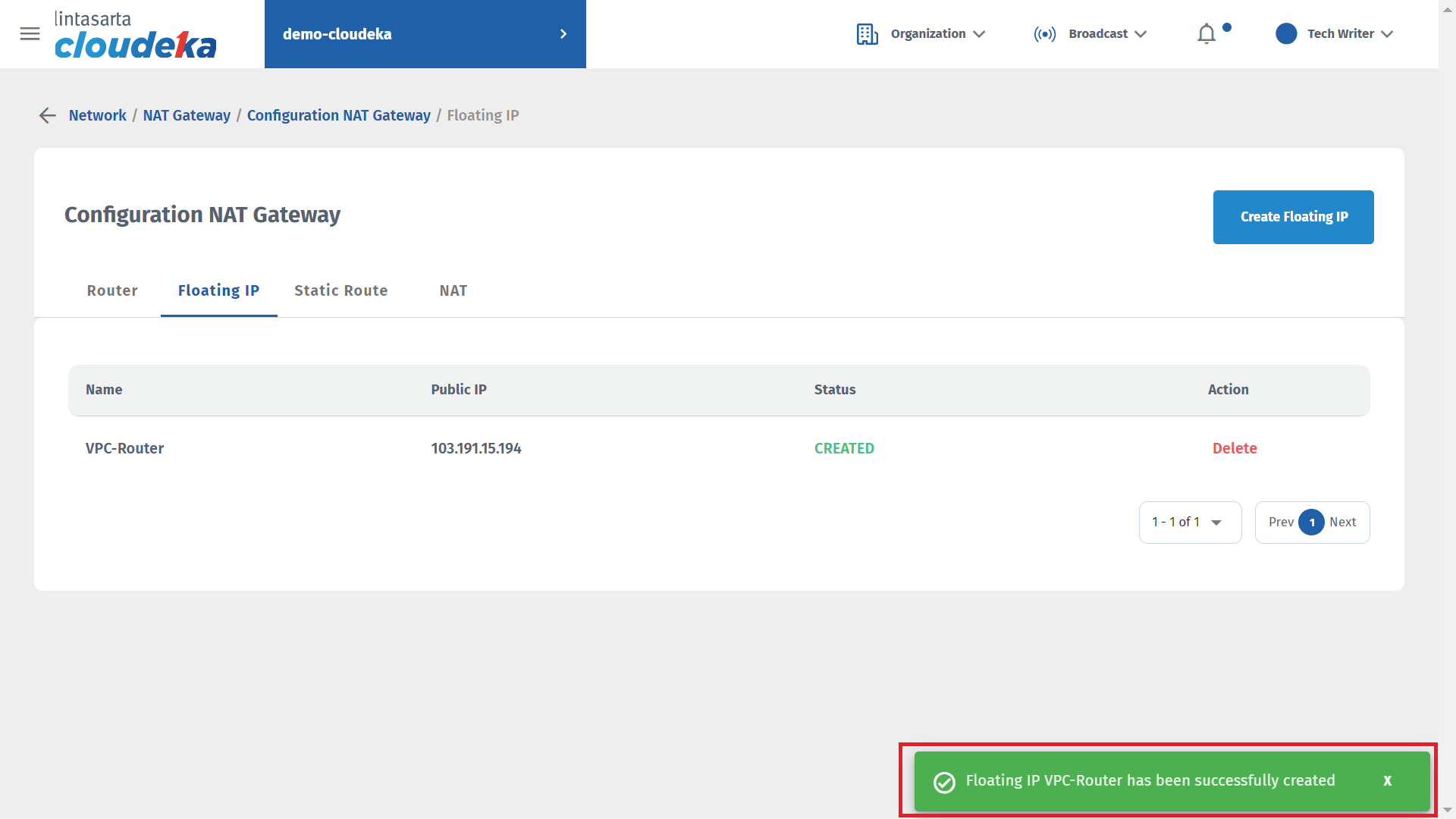 * The notification "Floating IP \[floating IP name] has been successfully created" appears that the Floating IP has been successfully added to the NAT Gateway.