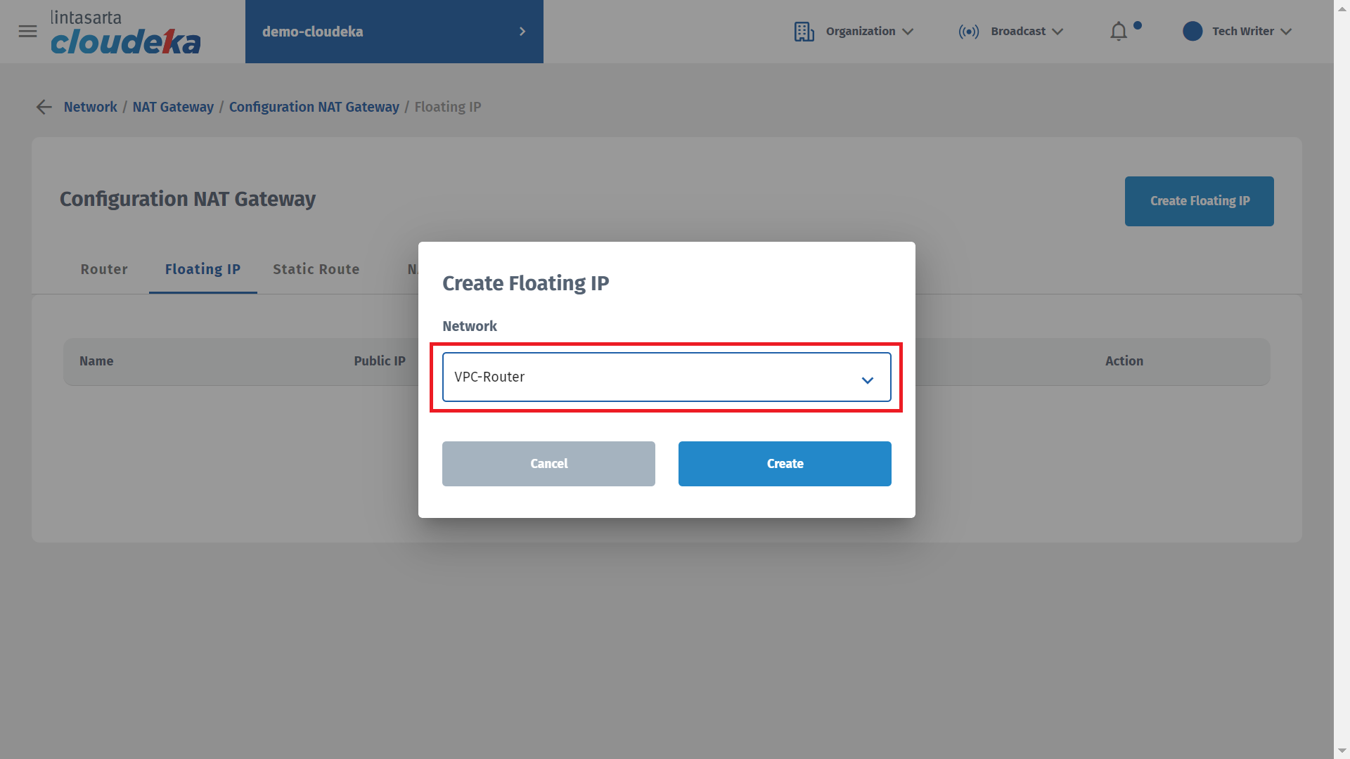 <figure><img src="https://putri.box.cloudeka.id/cloudeka-assets/static/images/22dekarouter/22.9%20create.png" alt=""><figcaption><p>Add Floating IP</p></figcaption></figure>
