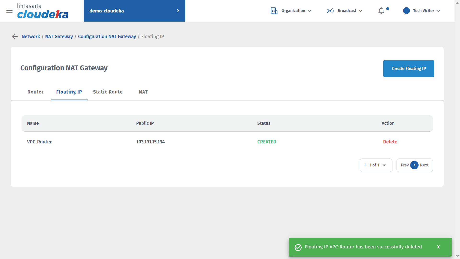 * The notification "Floating IP \[floating ip name] has been successfully deleted" appears that the Floating IP has been successfully deleted from the NAT Gateway.