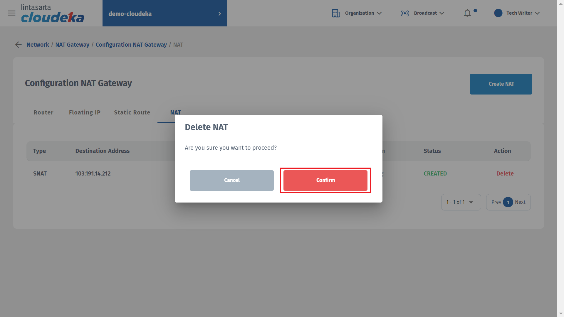 * Press the Confirm button to continue the process of deleting the NAT configuration.