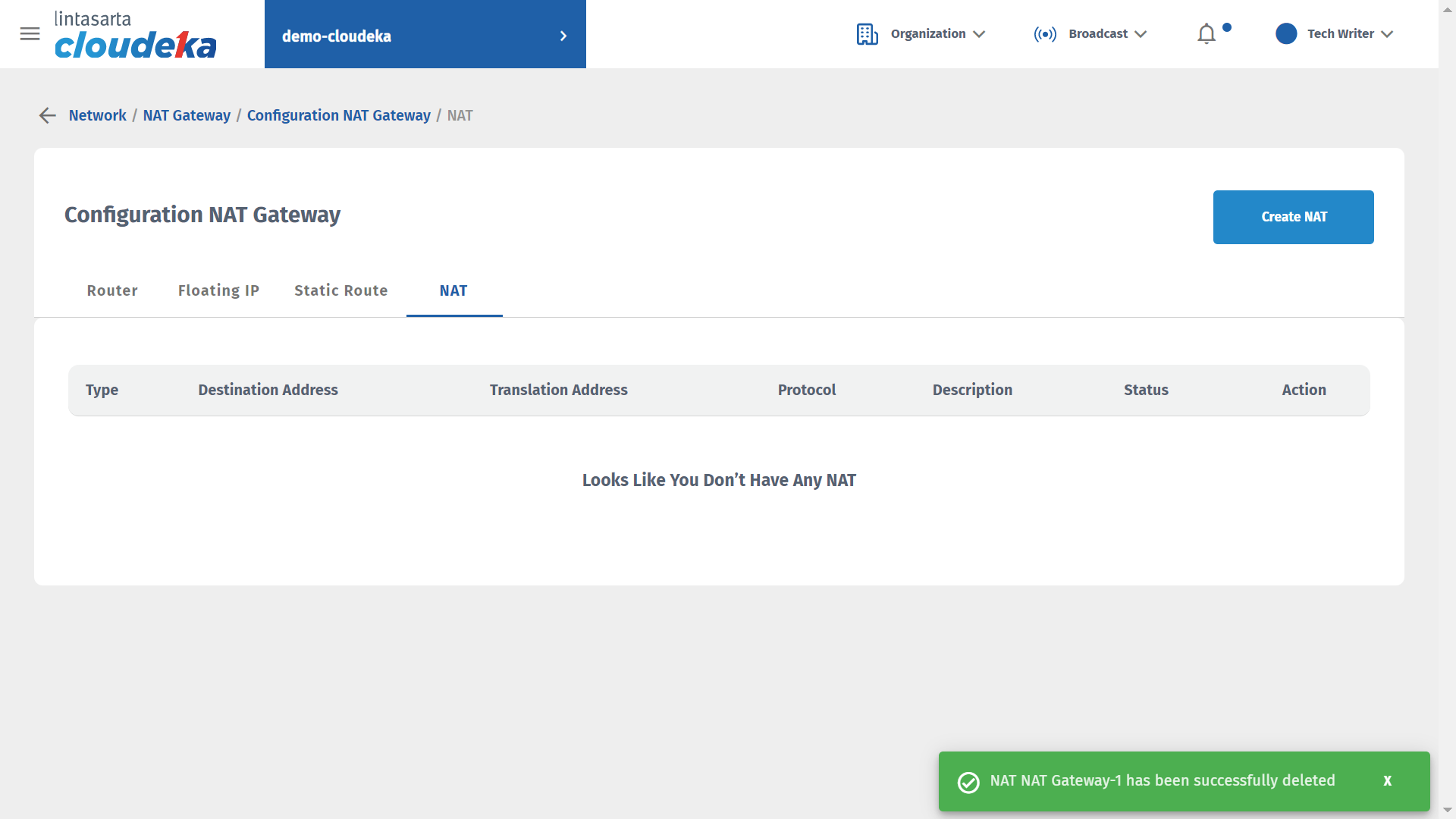 * A notification appears NAT \[name of nat] has been successfully deleted.
