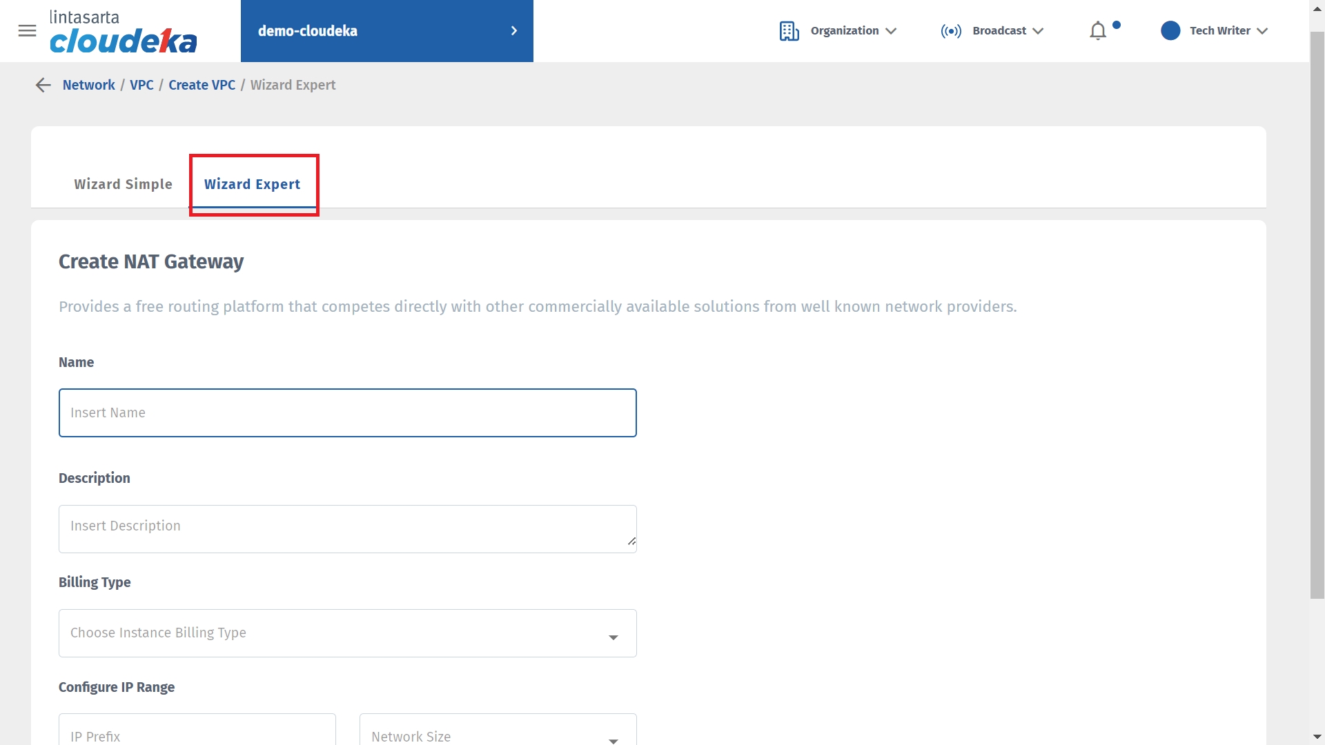 Select the Wizard Expert label and fill in all the fields to create a NAT Gateway.