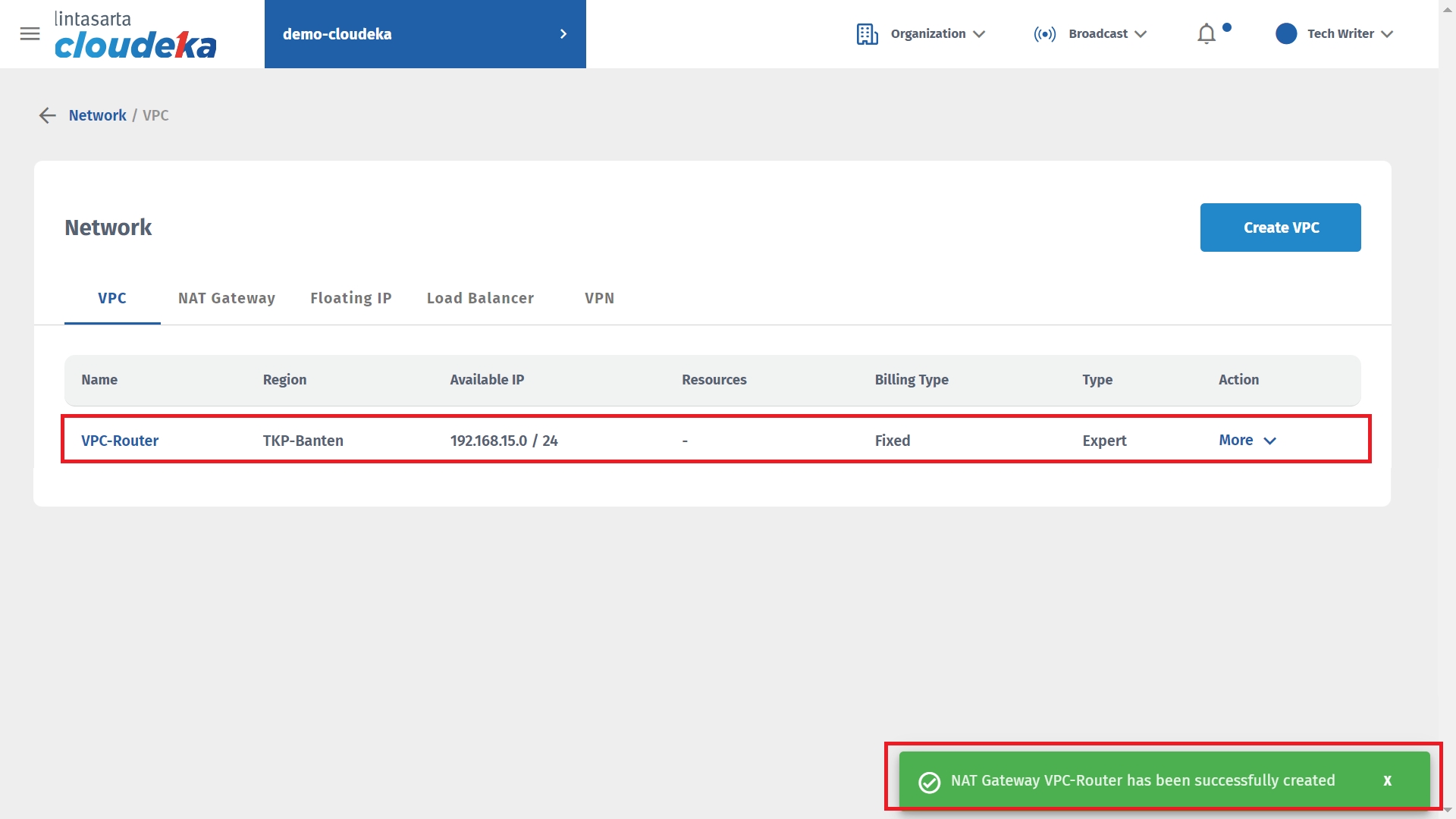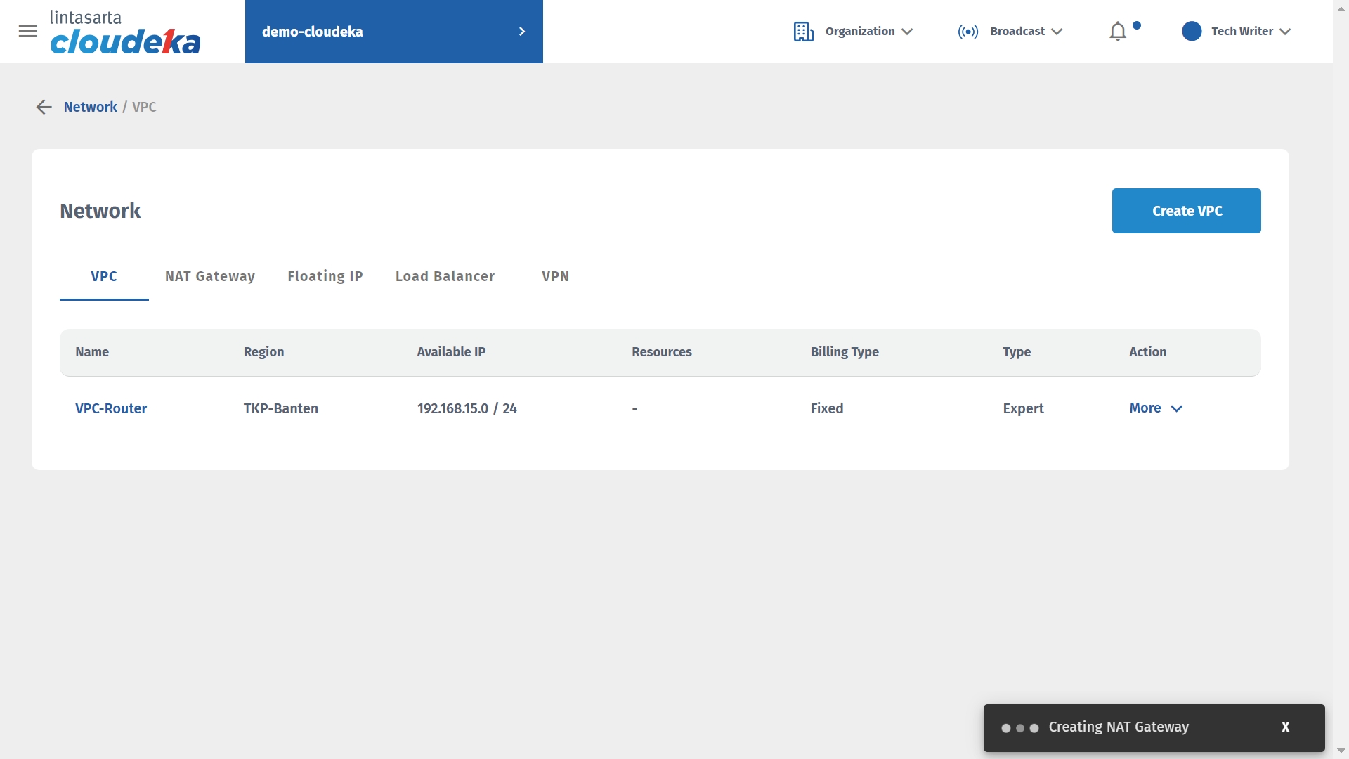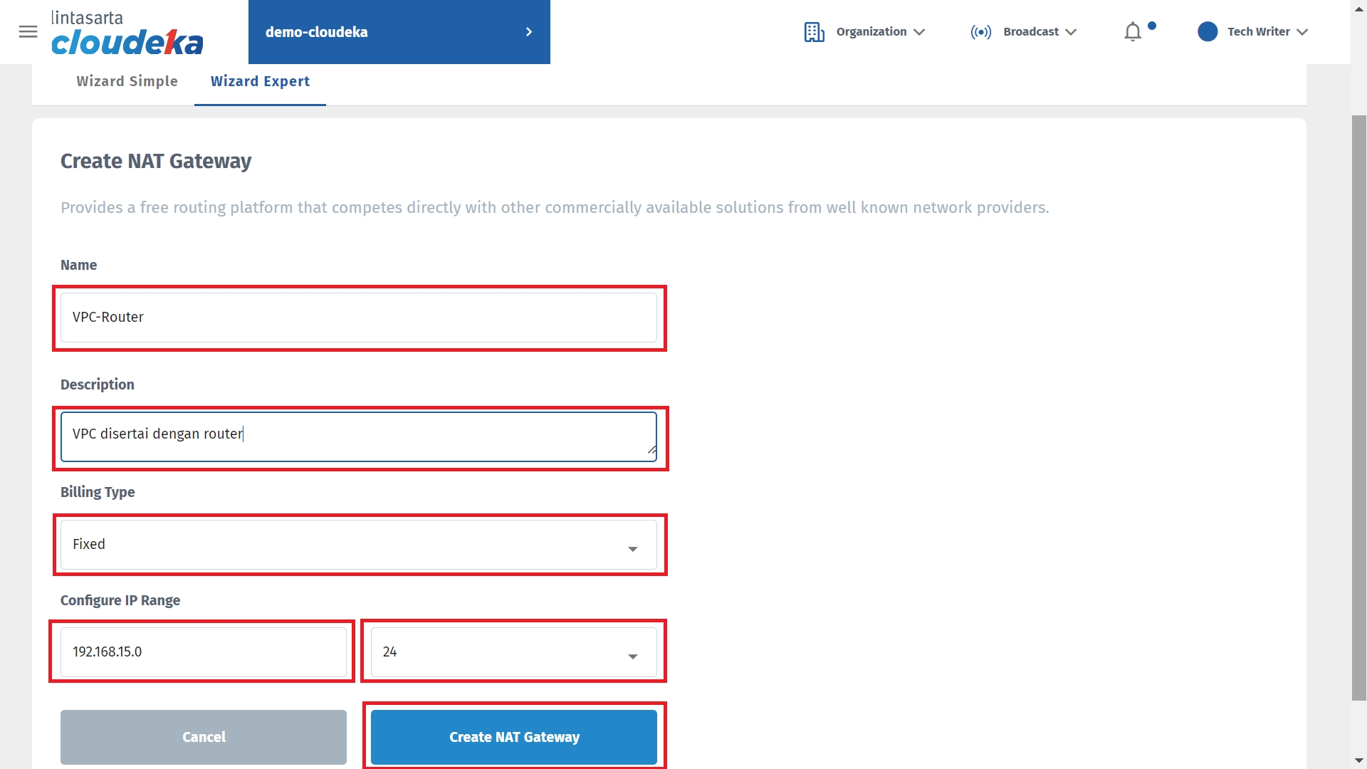 The following is a guide to creating a NAT Gateway on the Cloudeka portal service: