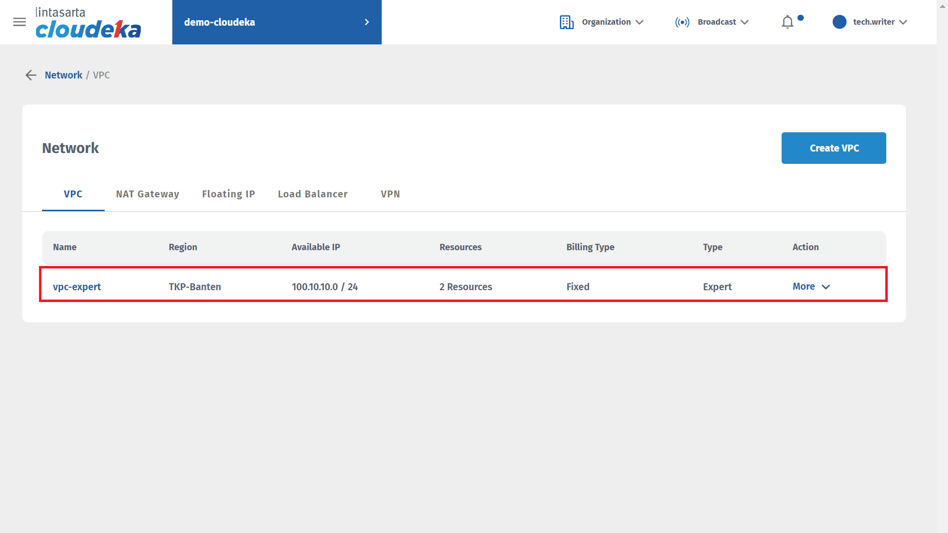 The first step to run telnet on your virtual machine is to create a VPC with the Expert type. For further guidance on creating an Expert type VPC, see the sub-chapter [Create NAT Gateway.](https://docs.cloudeka.id/deka_flexi/nat-gateway/remote-instance/create-vpc-expert) After successfully creating a VPC, you can see that the type in the VPC list is Expert and in the Available IP column it uses IP Network 100.10.10.0/24.