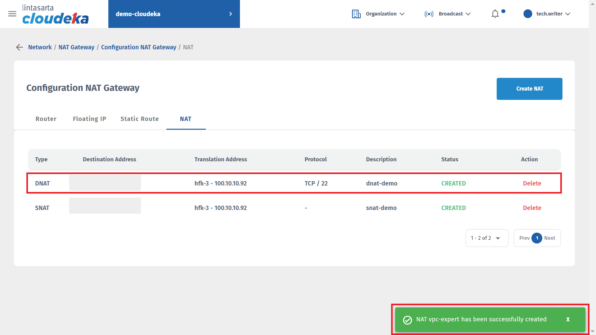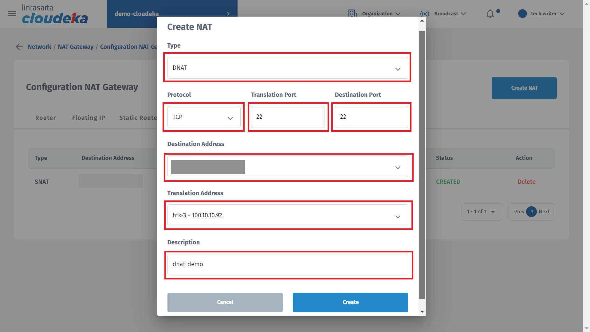 In the Type column, select DNAT because VPC will provide external network access to access virtual machines on the Cloudeka portal service. For the Protocol column, select TCP and enter Translation Port TCP, namely 22 and Destination Port is the port that will be used to alias the port that Translation Port uses. In the Destination Address column, select the floating IP address that was previously created, in the Translation Address column, select the virtual machine that will use the DNAT configuration, in the Description section, it is optional for you to explain the configuration that is being created, and press the Create button to continue the process of creating the DNAT configuration. on the VPC.