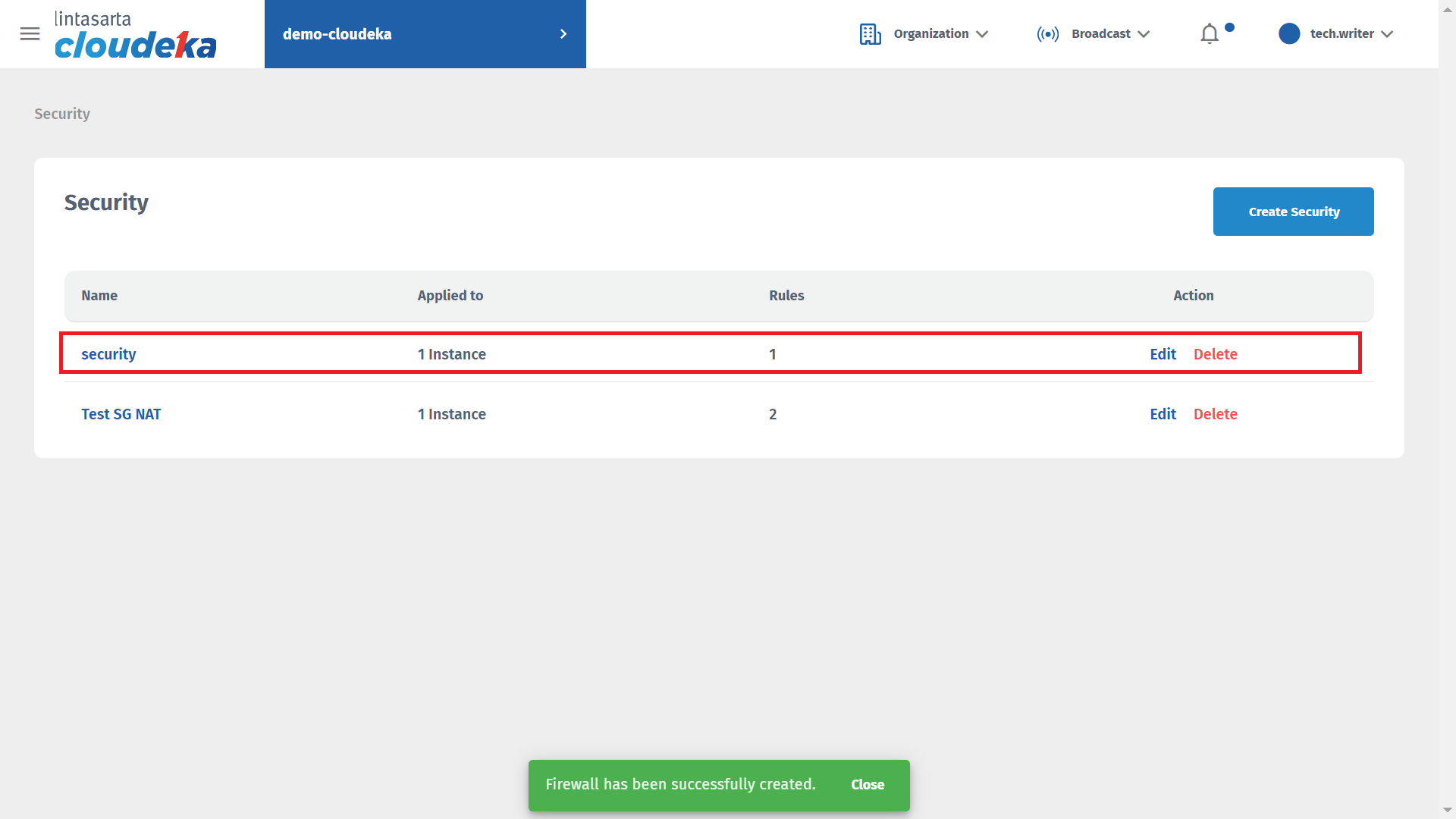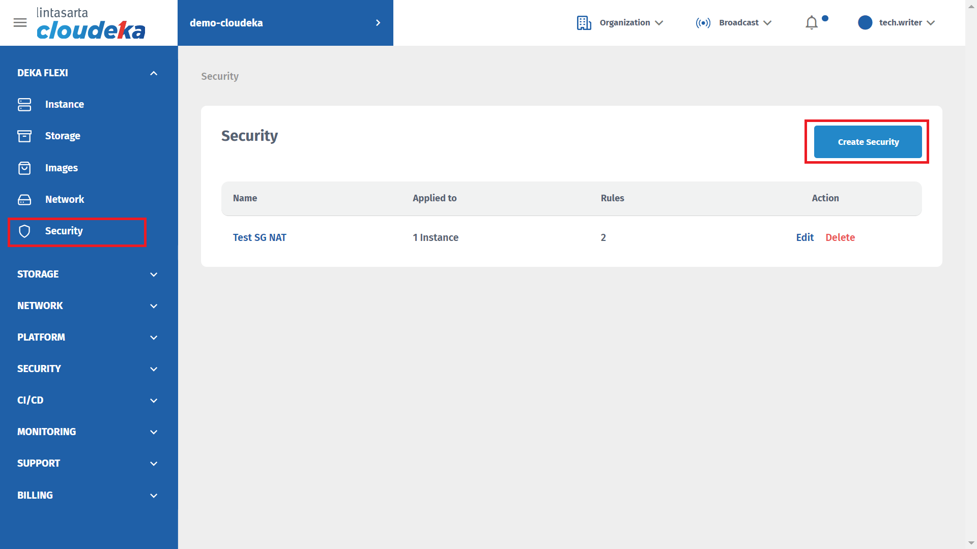 The next step is to add incoming rule configuration to the Security menu. On the Security menu page, press the Create Security button.