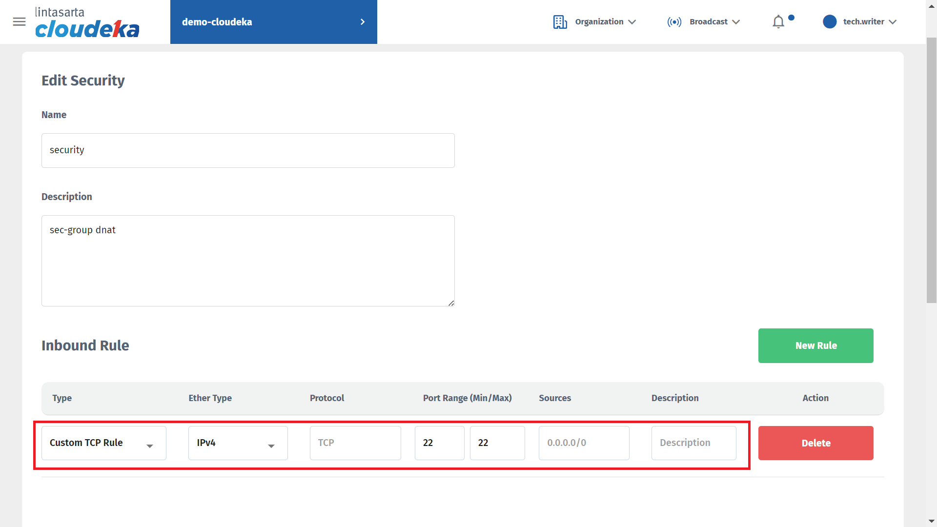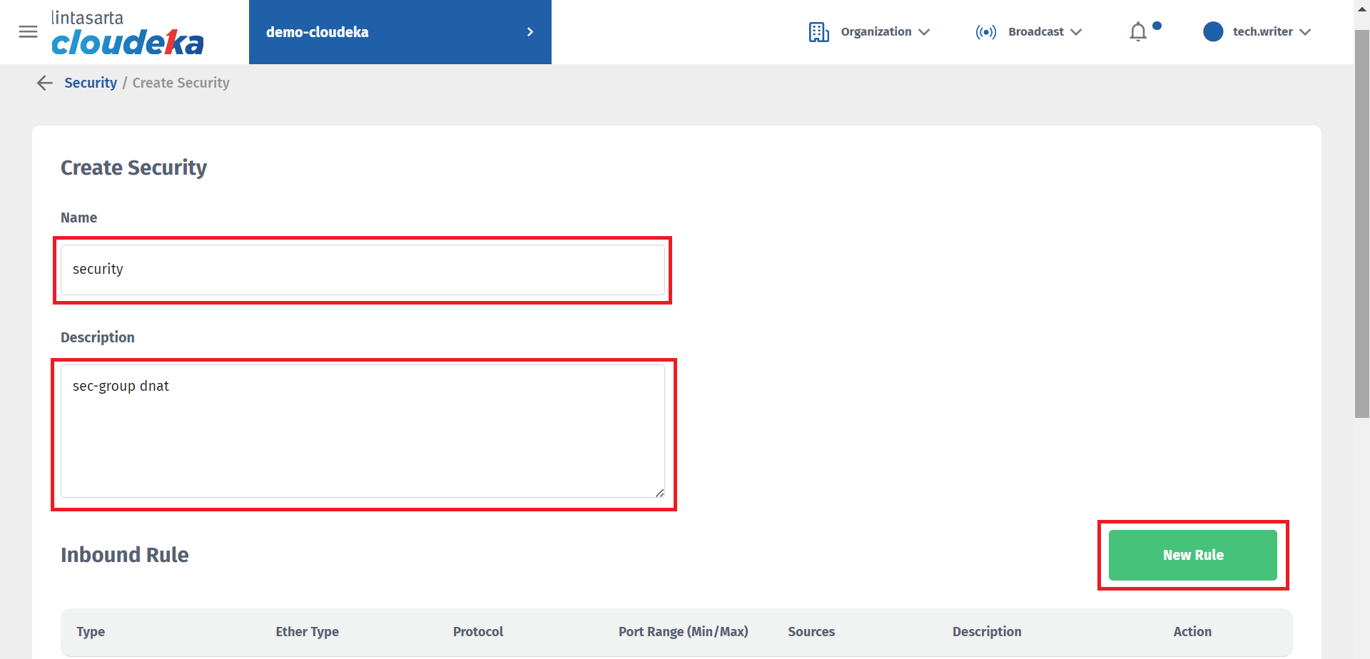 Fill in the Name, Description columns, and in the Inbound Rule section press the New Rule button.