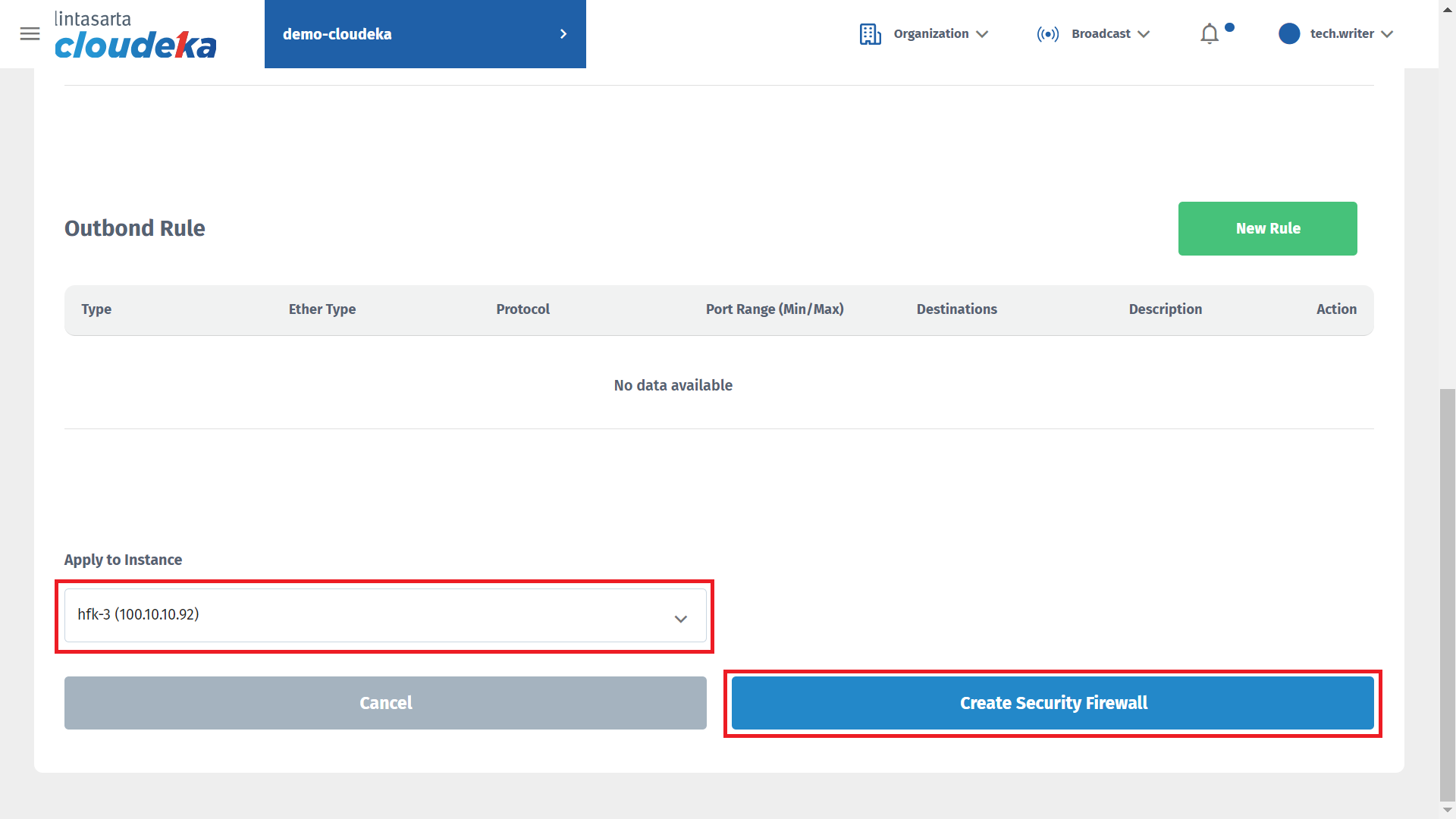 Make sure to deploy on a virtual machine that has VPC configured and press the Create Security Firewall button to continue the process.
