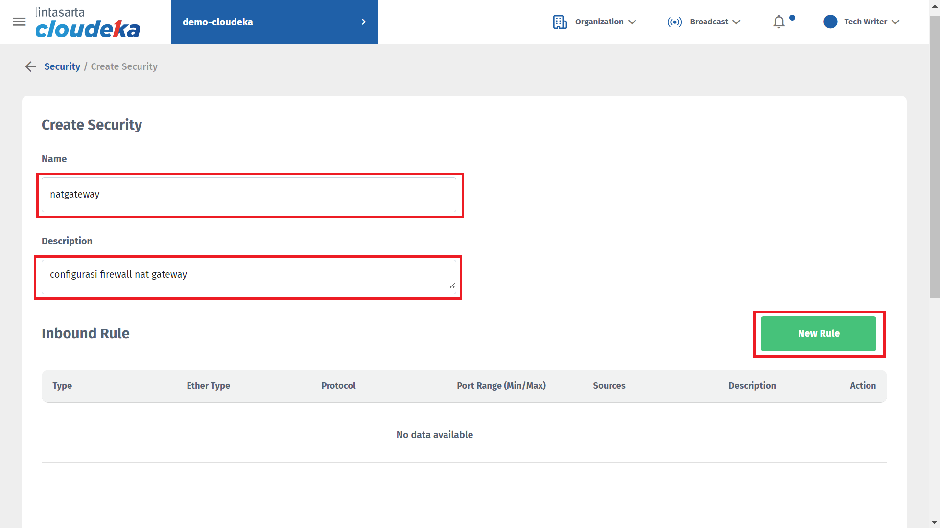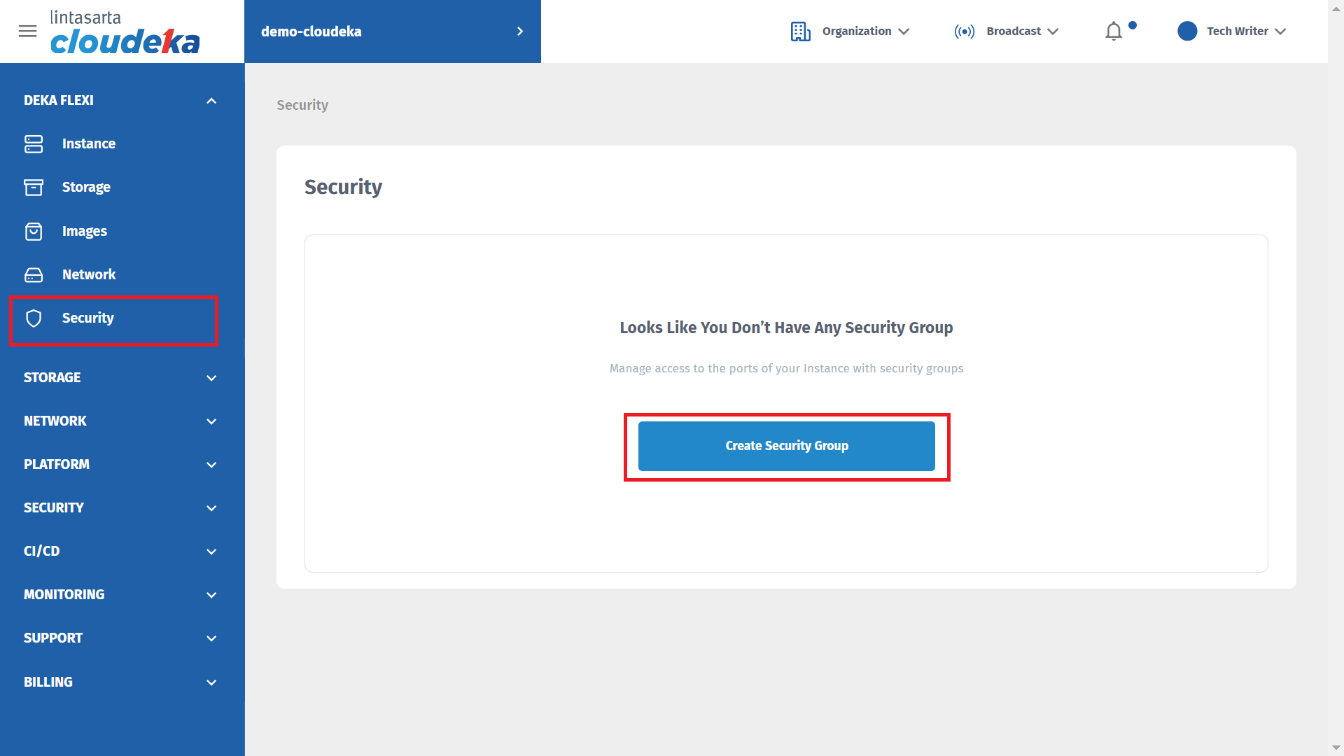 On the Cloudeka portal service, select the Security menu and press the Create Security Group button to add the firewall configuration that will be used.