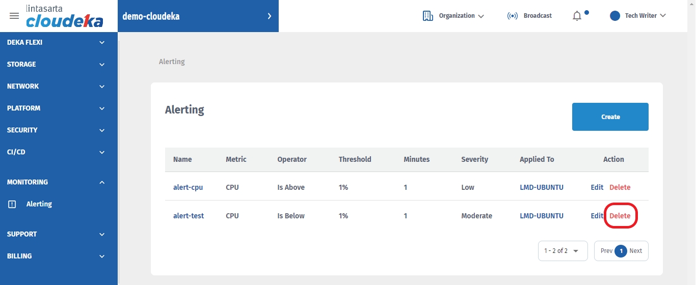 On the Alerting page, click the Delete button.