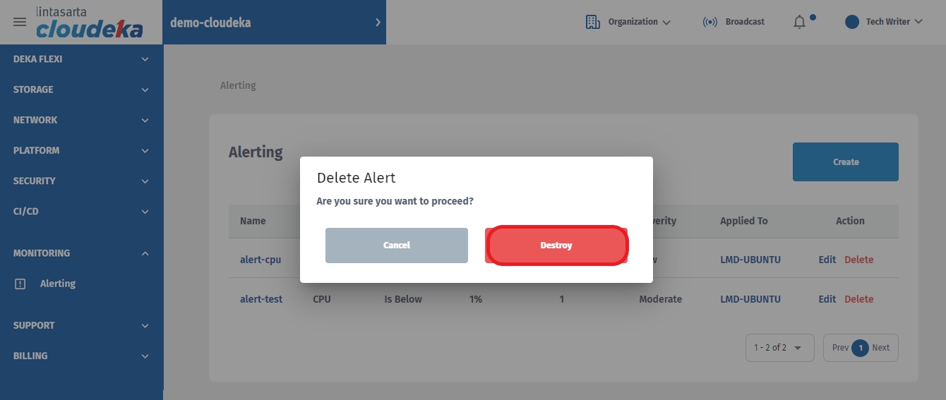 Click the Destroy button to start the process of deleting Alert data or cancel if you don't want to continue the process.