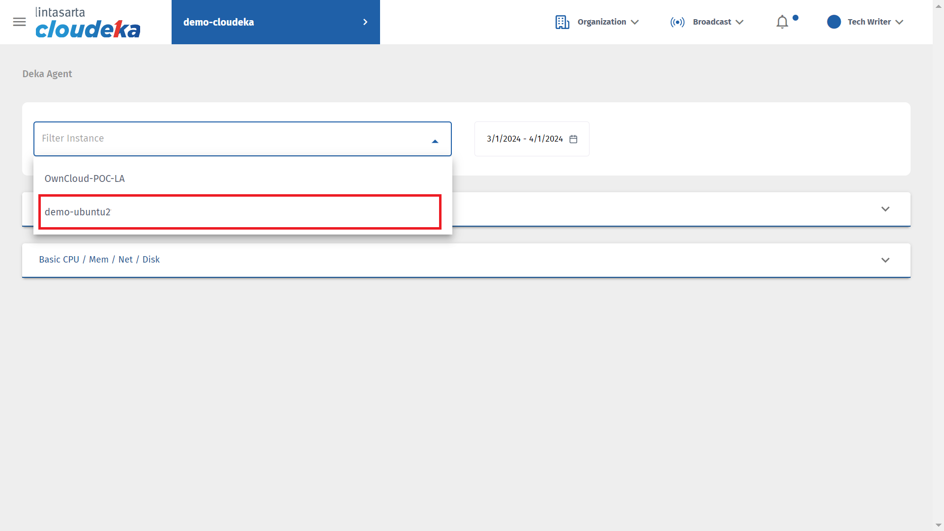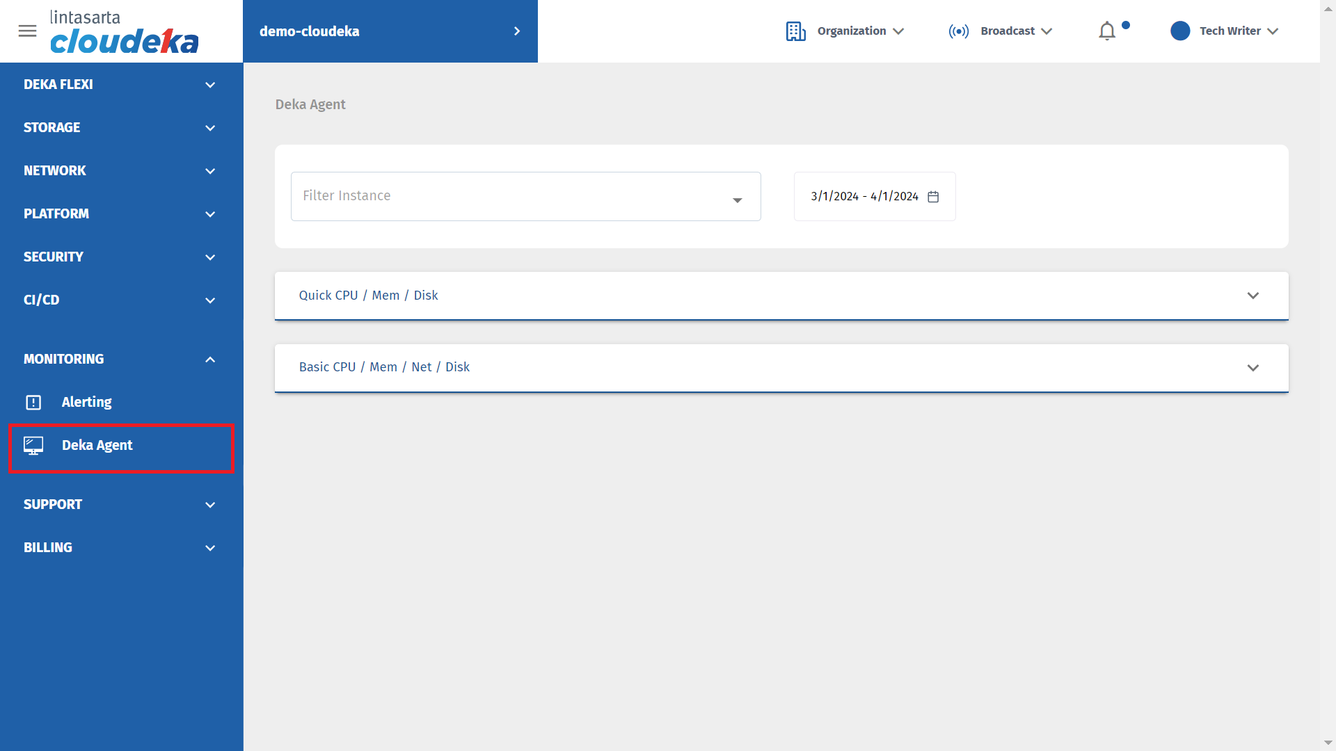 You can monitor the Deka Agent used on all virtual machines in the Instance menu via the Deka Agent menu in the Monitoring module.