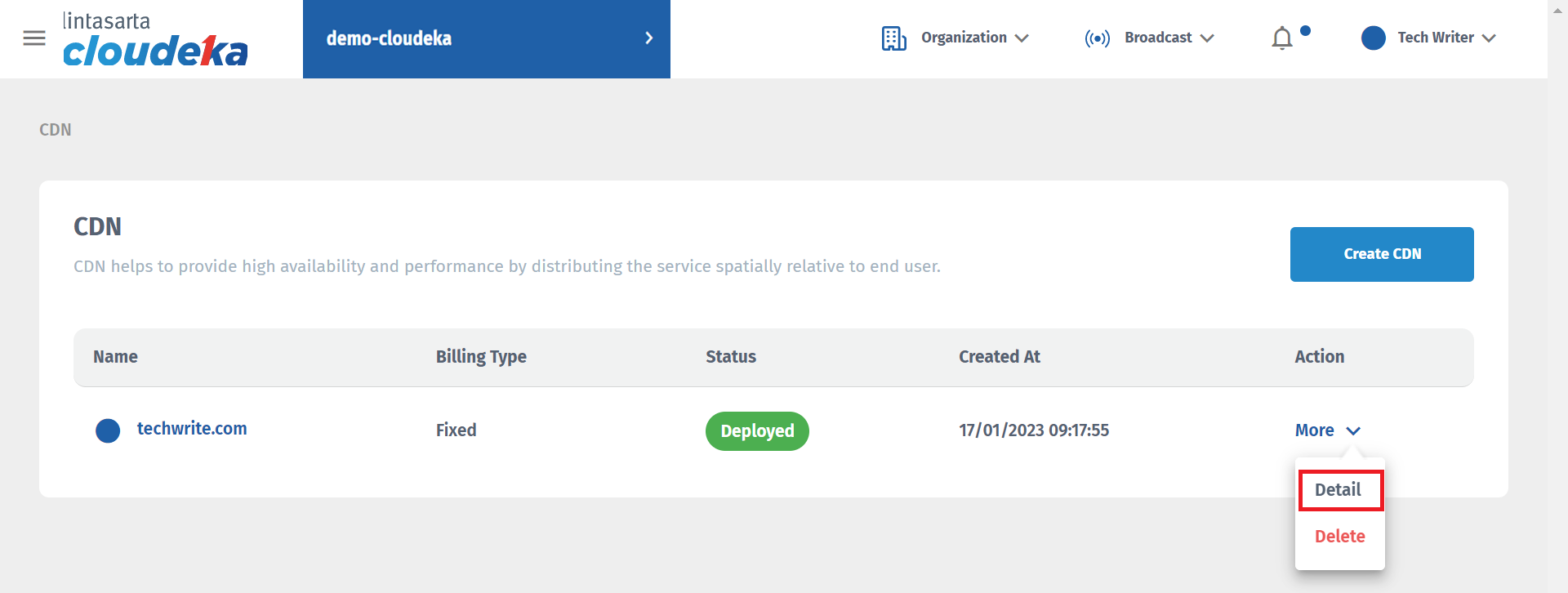 * On the CDN menu page, in the Action column, click More button select Details button.