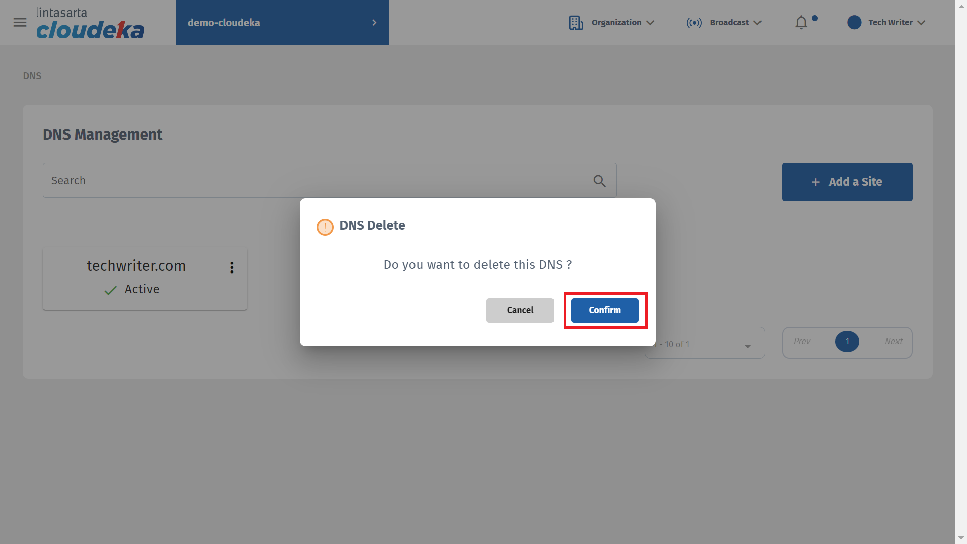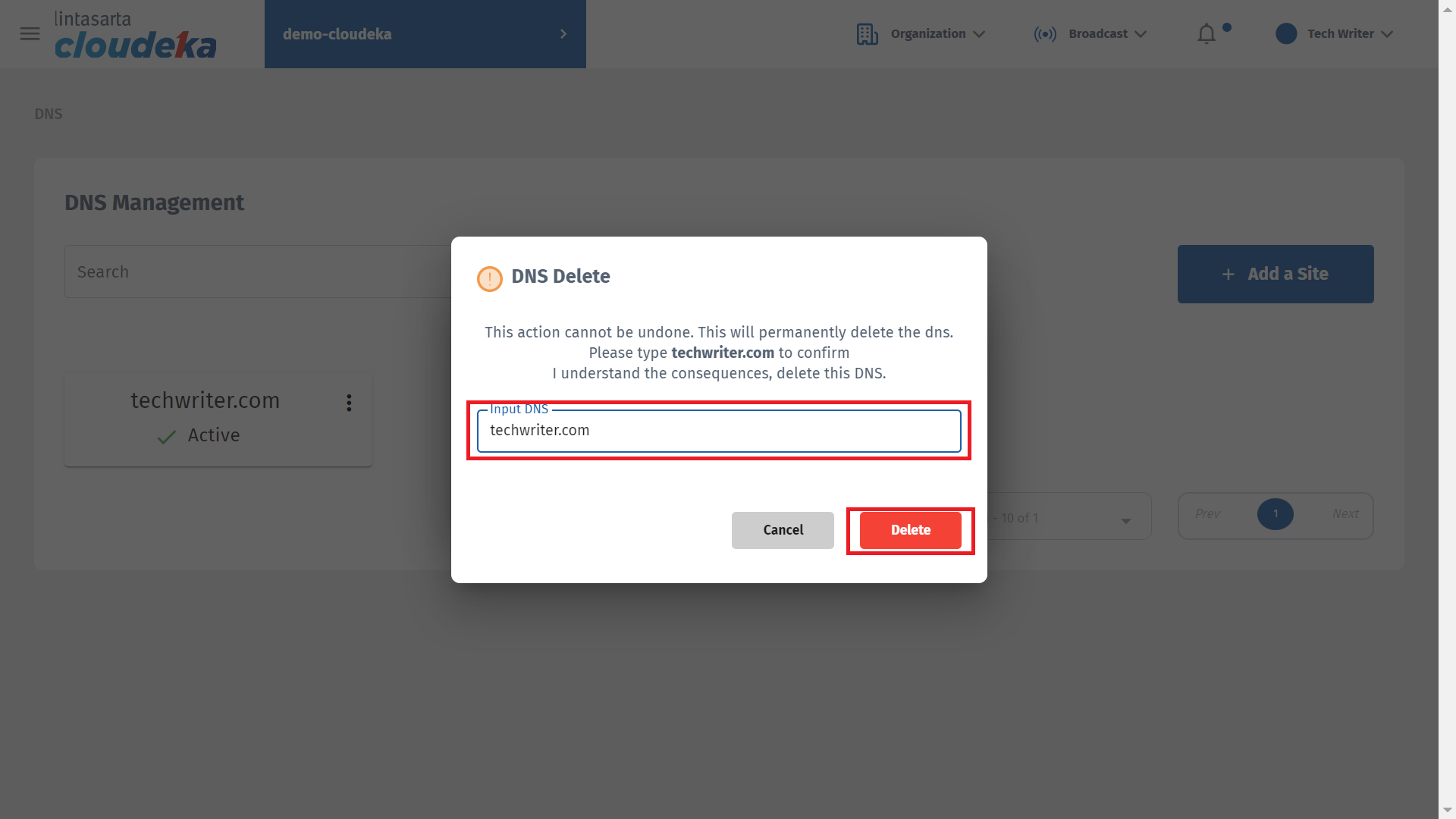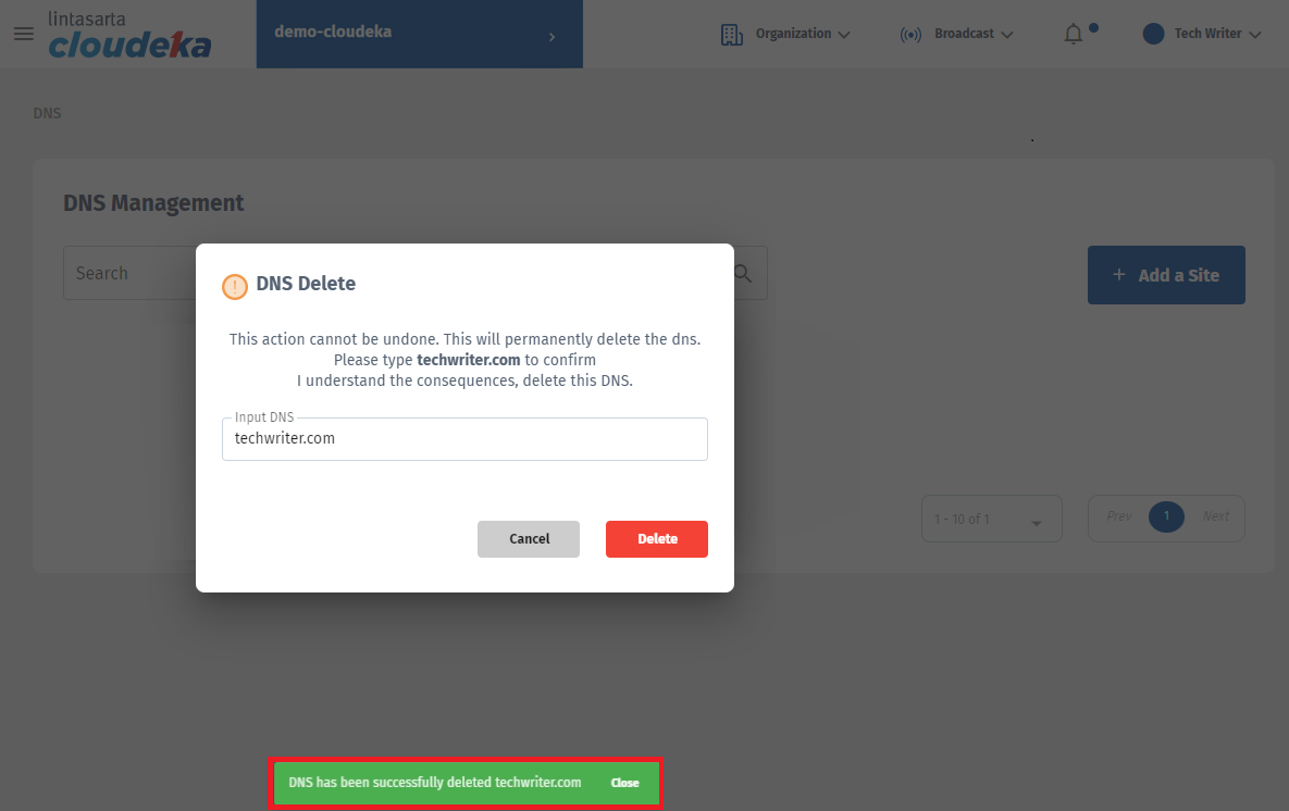 * A notification appears **DNS has been successfully deleted techwriter.com**